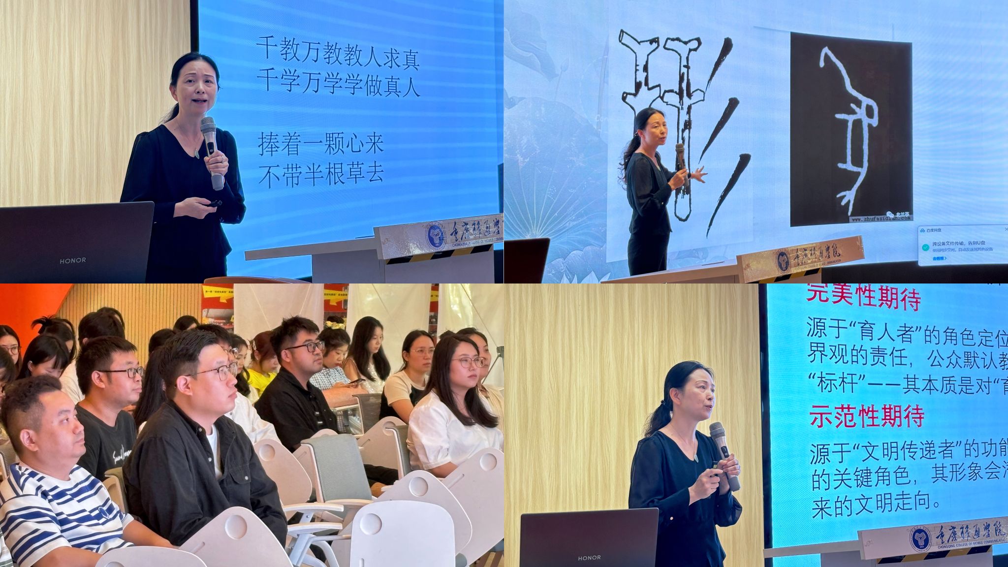 骆鹏副教授作为重庆市艺术专家库成员、中国写作学会理事、重庆市委宣传部宣讲团培训专家,在礼仪与形象塑造领域深耕多年,兼具学术积淀与实践经验。讲座伊始,她便以“什么是理想的教师形象”引入思考,并引经据典了著名教育家孔子“学而不厌,诲人不倦”及陶行知“捧着一颗心来,不带半根草去”为核心观点,开启了本次培训。