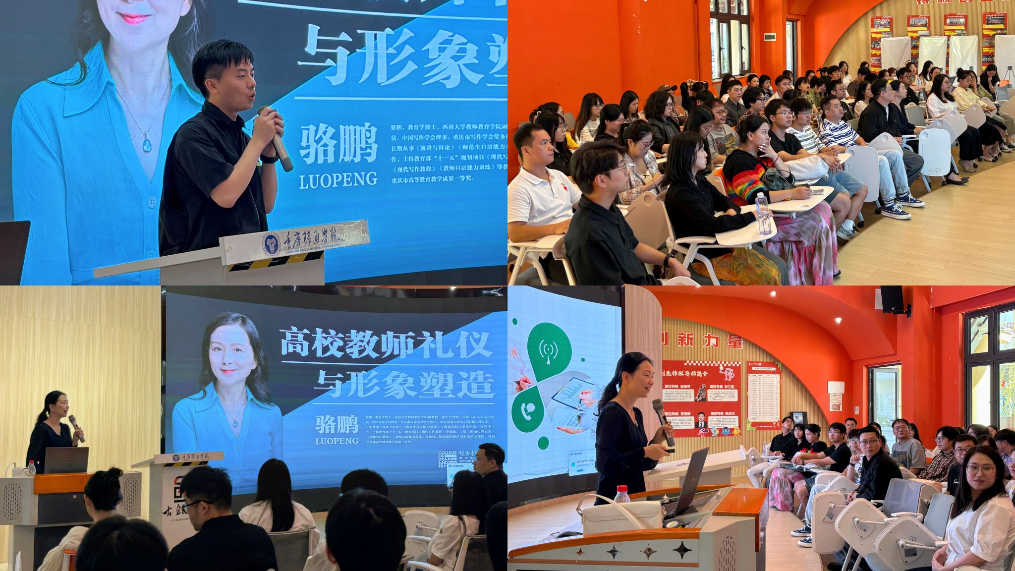 为提高戏剧影视学院教师教学核心技能,提升礼仪素养与形象塑造能力,以更好的面貌和仪态进行日常教学与对外交流。同时借助教师教学核心技能培训,全面提升新老教师日常教学、教学竞赛能力,实现新教师到成熟教师、普通教师到教学能手的快速转化,以应对合格评估的教学要求。2025年9月24日16:30,西南大学骆鹏副教授莅临戏剧影视学院古剑书院含光报告厅开展高校教师礼仪与形象塑造专题培训,解码高校教师礼仪与形象的专业内涵。戏剧影视学院全体教师积极参与,共赴这场兼具理论深度与实用价值的礼仪素养提升盛宴。
