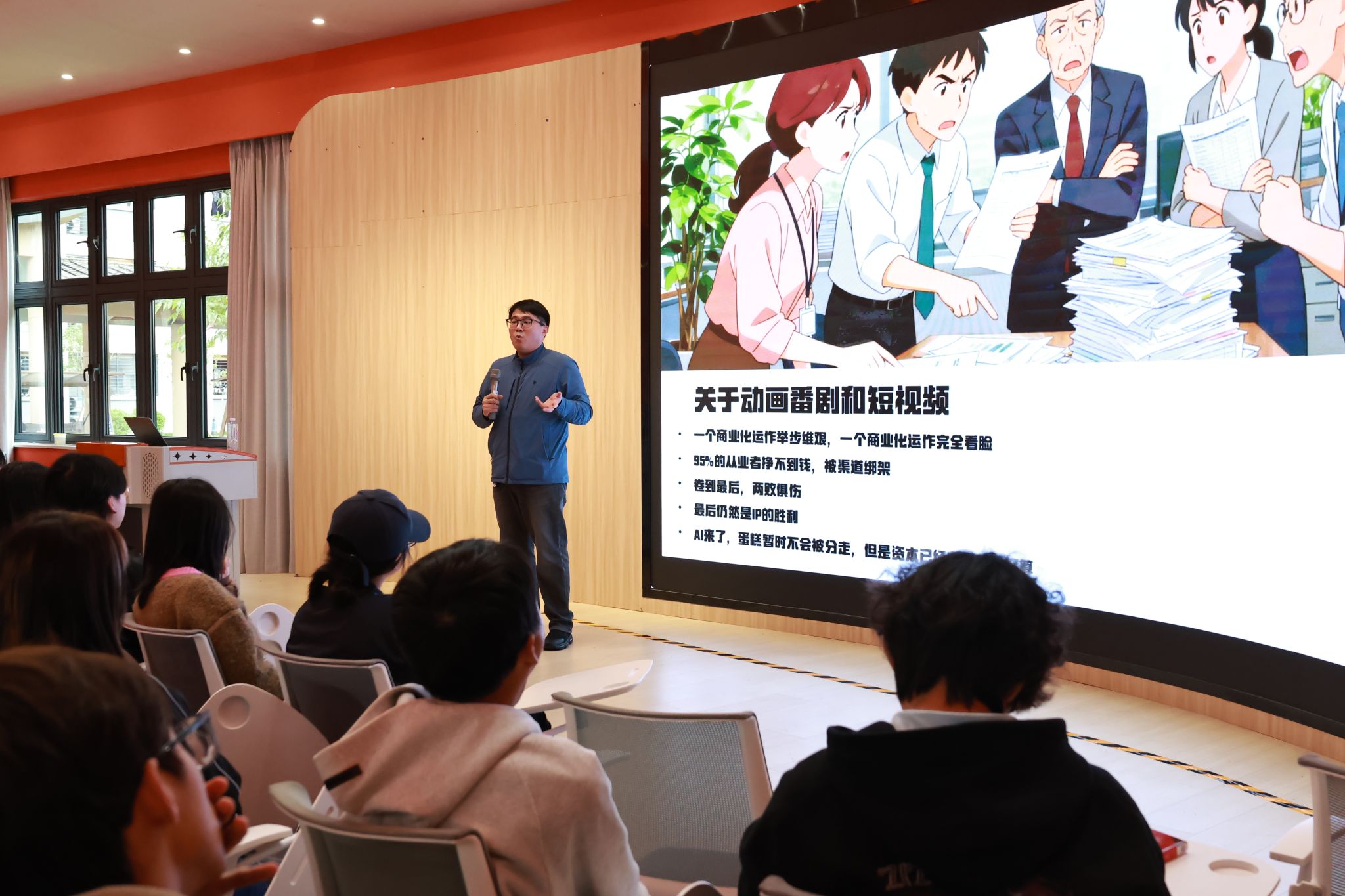 在IP运营策略方面,讲座结合“我是不白吃”“萌芽熊”“菜狗”等典型案例,深入剖析了从“人格注入”到“生态拓展”的双引擎运营路径。重点阐释如何为IP注入独特人格并精准定位其情感价值,以在信息流中迅速吸引用户。同时强调,成功IP应具备在内容中实现商业闭环的能力。此外,还分享了在IP孵化初期如何通过“数据感知”与“情感共鸣”进行低成本市场测试,以及在IP成熟后如何借助联名、授权与衍生品等方式持续拓展生态、实现长期价值增值。这些源于实战的经验总结,为在场师生及从业者提供了具有操作性的参考。