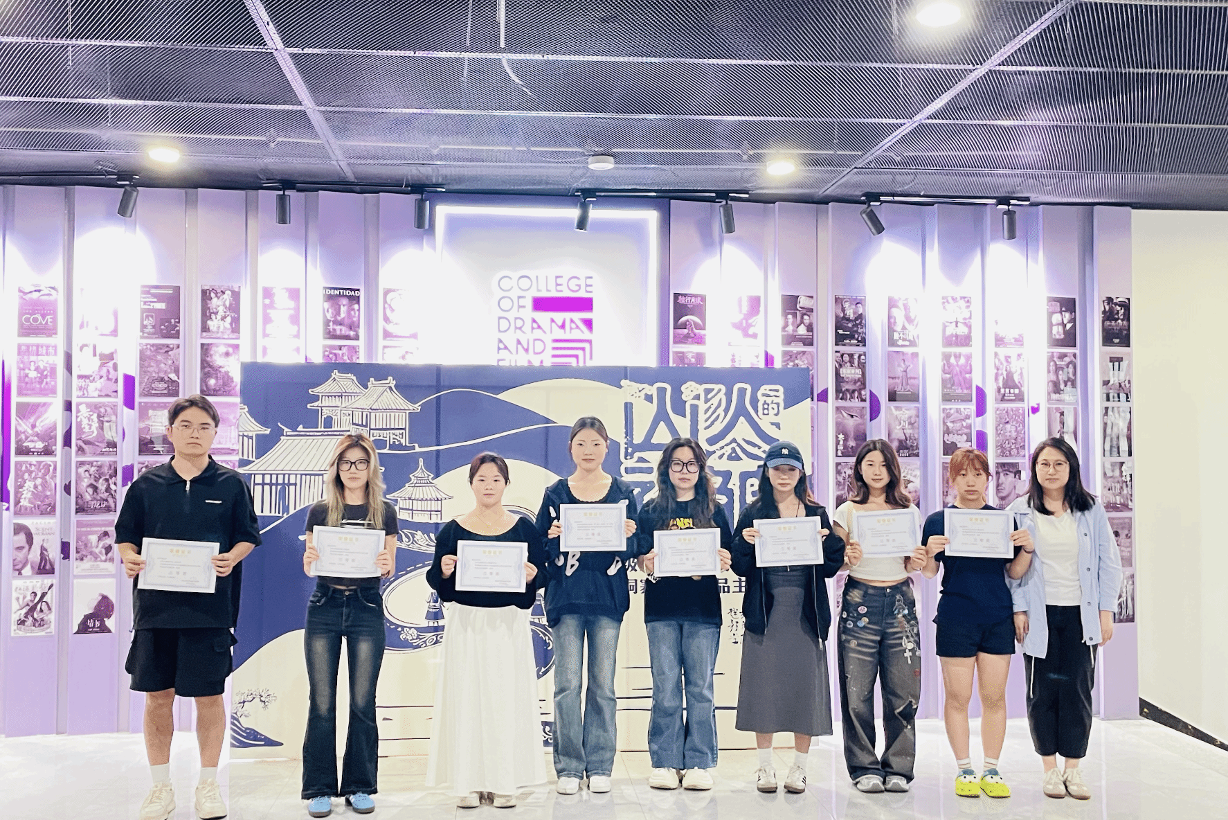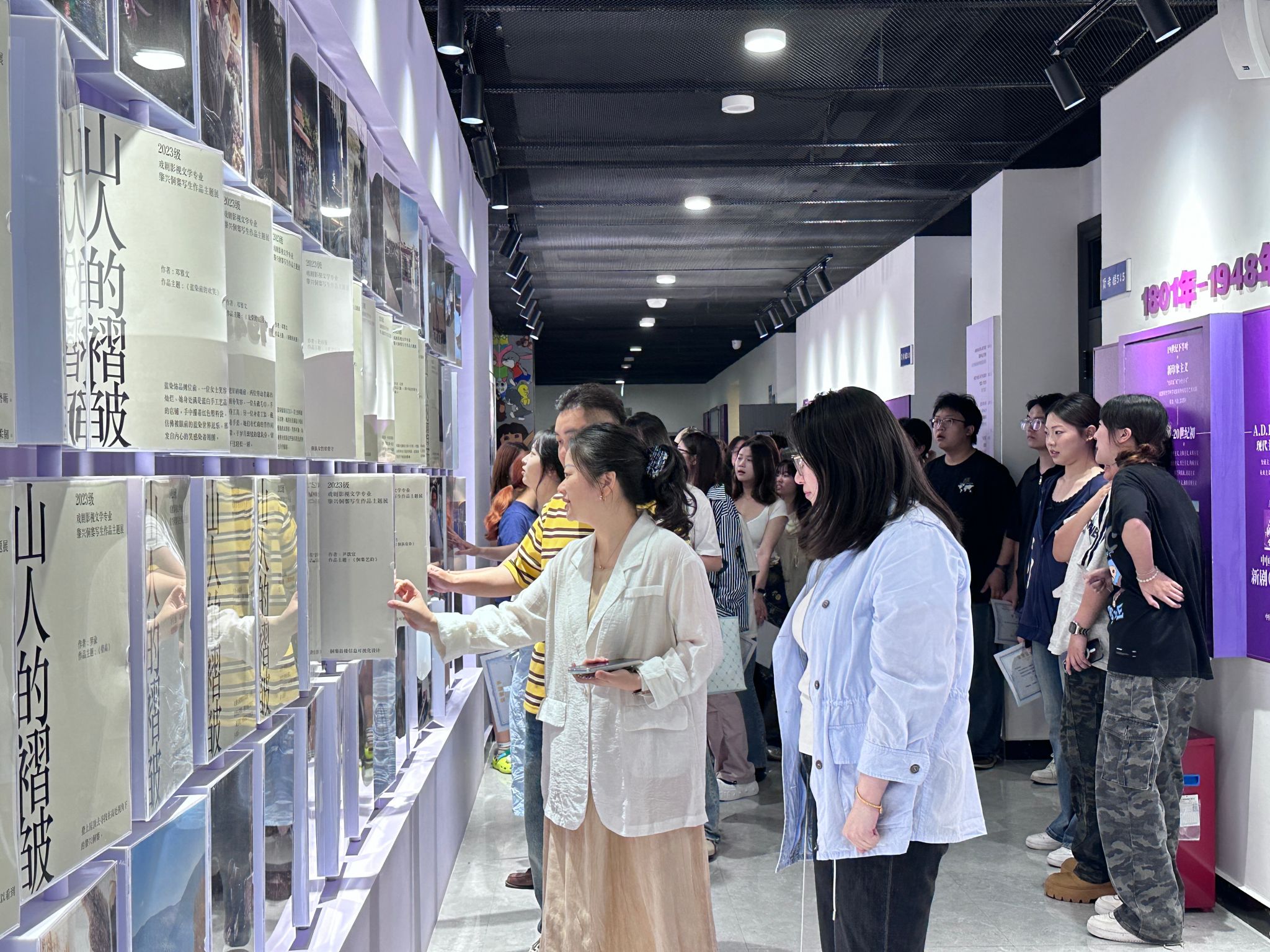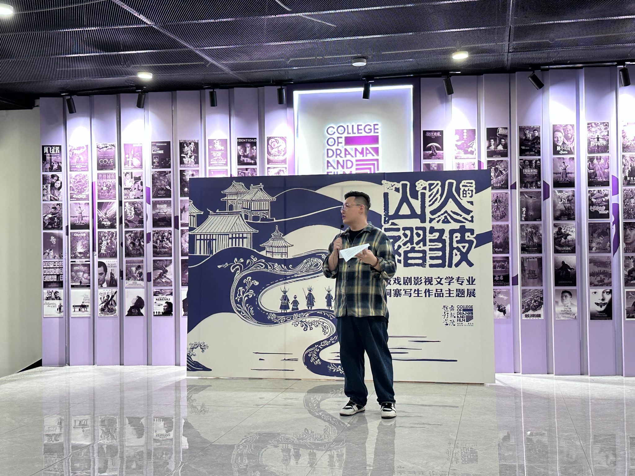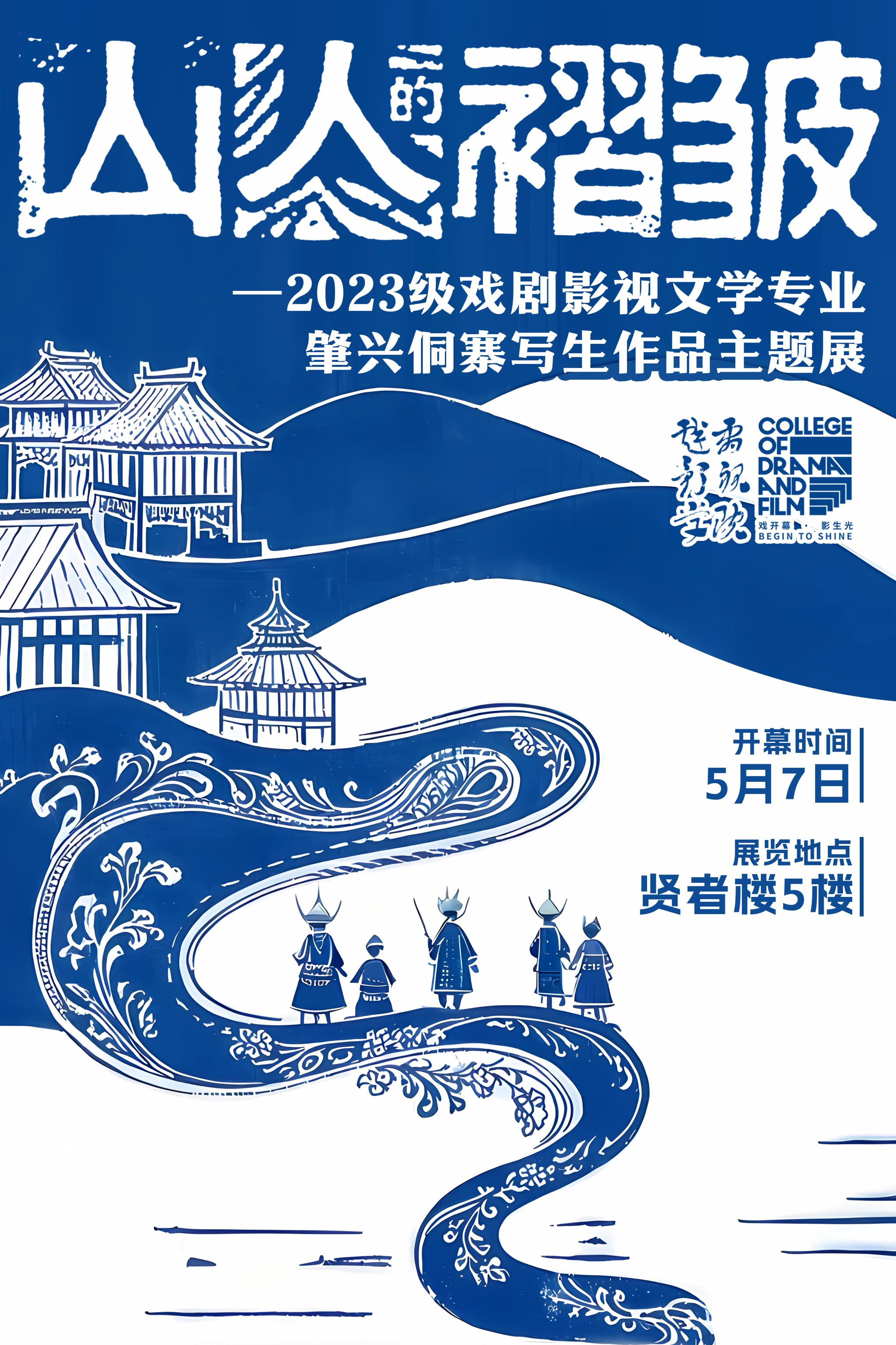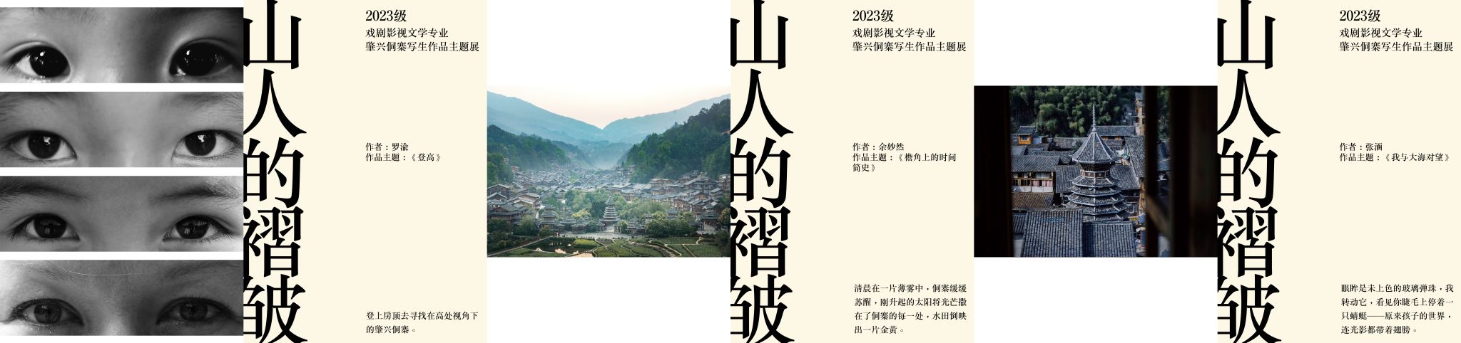 2025 年 5 月 7 日,戏剧影视学院作品展示区热闹非凡,2023 级戏剧影视文学专业肇兴侗寨写生作品展在此隆重开幕。本次展览以 “山人的褶皱” 为主题,23 级、24 级戏文专业同学、戏剧影视学院副院长王芳、影视工程教研室主任吴杨爽、影视文学与美术教研室主任杨帆、戏剧影视文学专业负责人郭嘉琦及教研室全体教师齐聚一堂,共同见证这场艺术盛会。