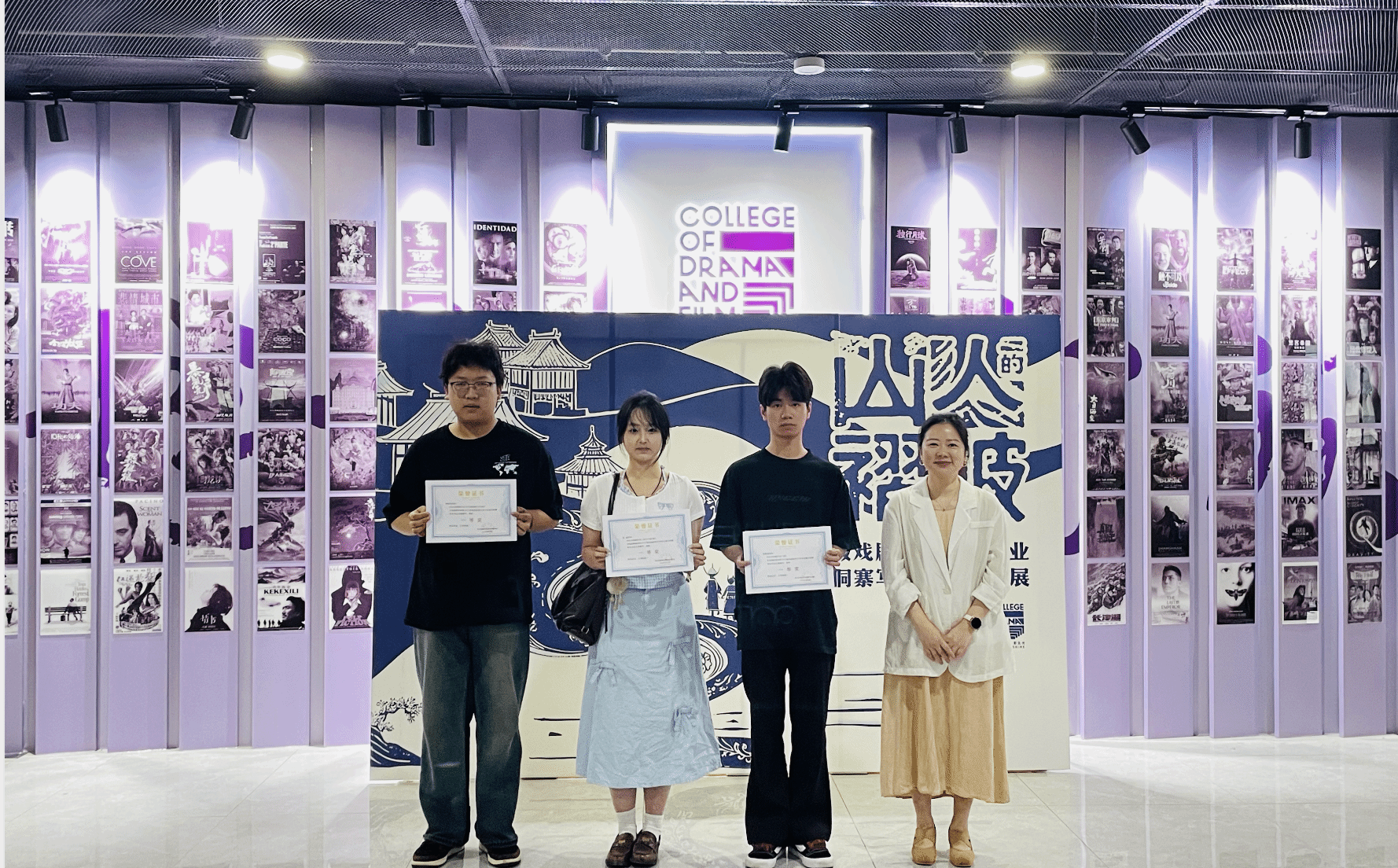 展览开幕式上举行了隆重的颁奖仪式。经过专业评委评选,38 件作品脱颖而出,分获不同奖项。李姗老师为获得优秀奖的余妙然等 7 位同学颁奖,郭嘉琦老师为获得三等奖的程严徵等 8 位同学颁奖,吴杨爽主任为获得二等奖的罗渝等 6 位同学颁奖,王芳副院长为获得一等奖的张涵等 3 位同学颁奖。这些获奖作品在风格、技术运用、艺术表达、创意视角等方面各有特色,展现了同学们对侗族文化的深刻理解和对社会现实的思考。