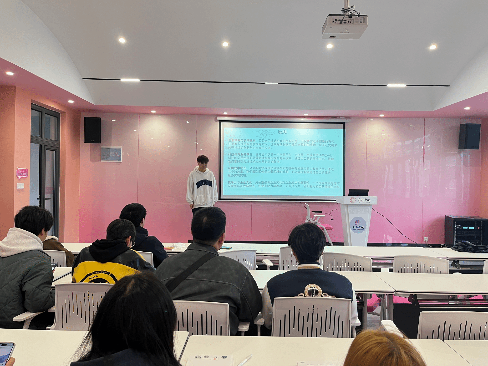 随后的分享环节中,几位学生代表纷纷登台,结合个人成长经历和对贝佐斯创业历程的理解,分享了他们的收获与心得。每位同学都表达了对贝佐斯的崇敬,并探讨了如何在面对职业生涯中的挑战时,借鉴贝佐斯的坚持、果敢与远见。在分享中,同学们积极讨论了如何有效利用技术创新提升工作效率,以及如何培养自己在职场中的竞争力。