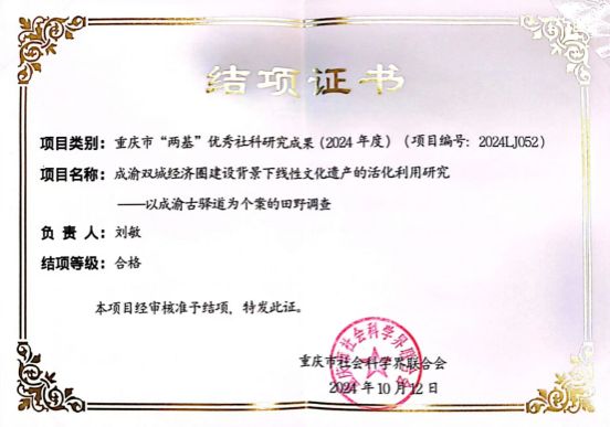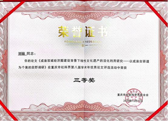 在社科研究领域,地域文化与城市发展研究院刘敏老师主持的课题项目《成渝双城经济圈建设背景下线性文化遗产的活化利用研究——以成渝古驿道为个案的田野调查》于重庆市“两基”优秀社科研究成果评选中脱颖而出,荣获三等奖。
