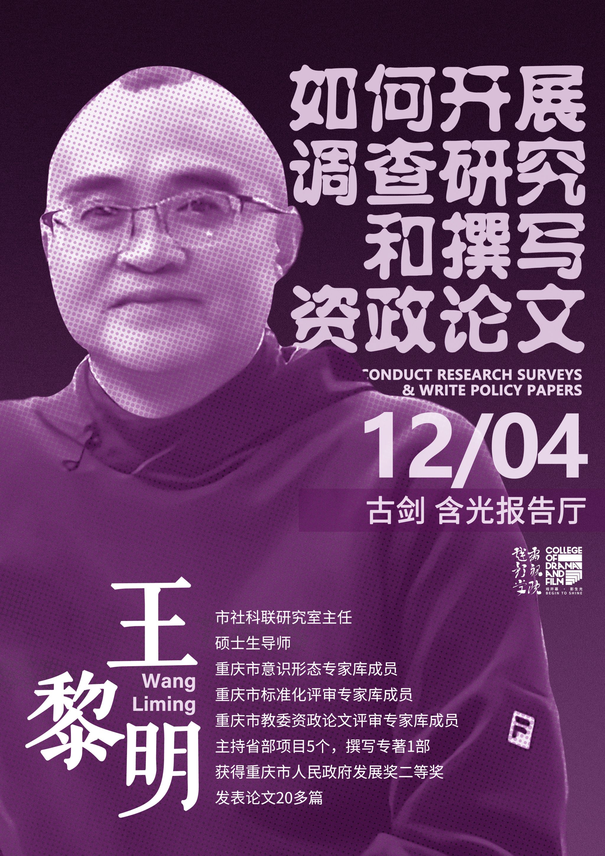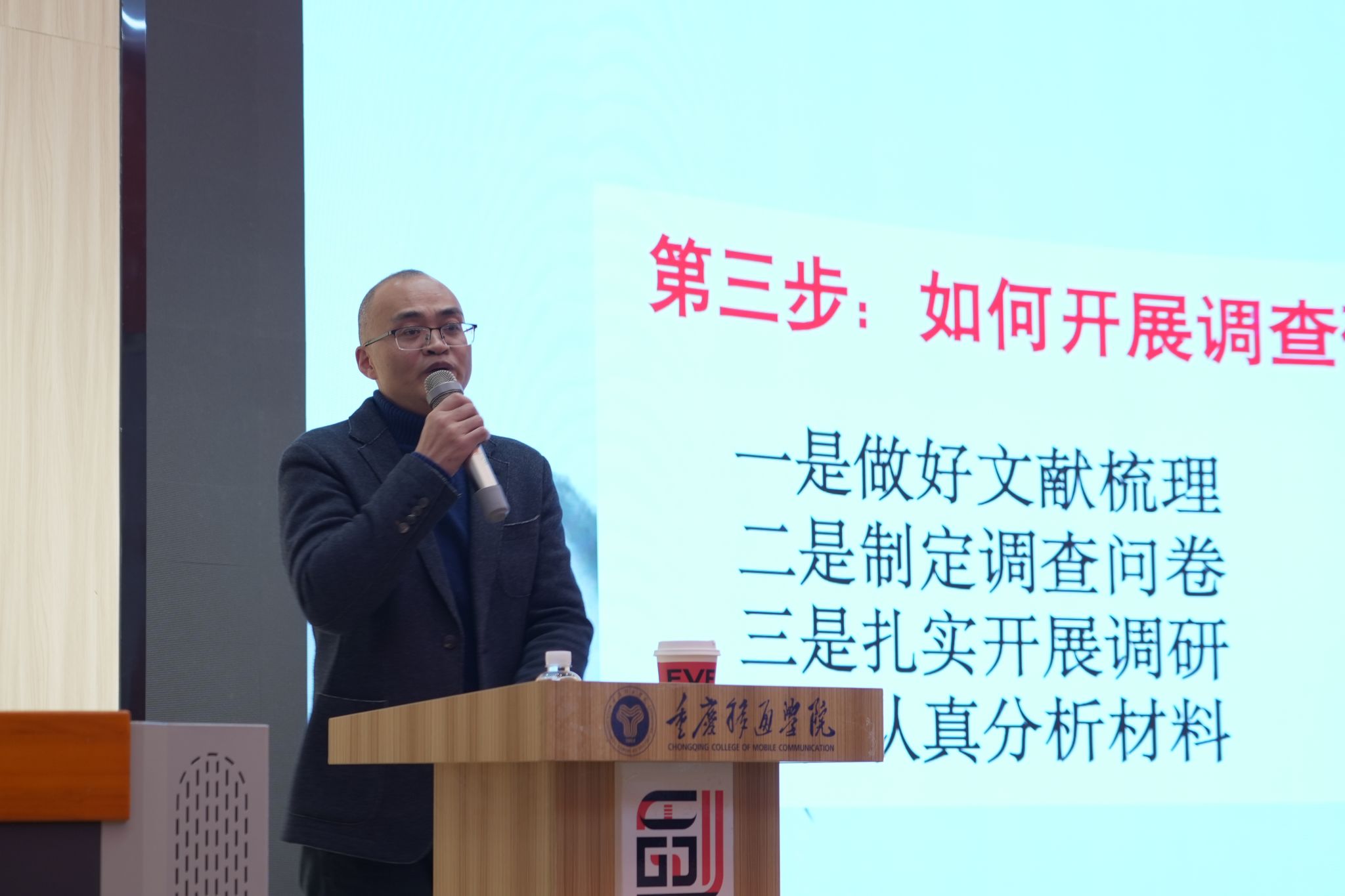 为提升我校教师调查研究能力、助力教师在学术论文写作、教改项目申报、教学材料撰写等方面的能力提升,全面提升教师政策素养、理论素养、写作素养,从而切实推动“内涵建设与质量提升”主题年活动,打造更多高质量教学成果、提升育人质量。12月4日,重庆移通学院戏剧影视学院特别邀请重庆市社会科学界联合会研究室主任王黎明在古剑书院含光报告厅开展了一场精彩的主题讲座。王黎明主任是理论研究和资政论文写作专家,是重庆市社会科学界联合会研究室主任,硕士生导师,重庆市意识形态专家库成员,重庆市标准化评审专家库成员,重庆市教委资政论文评审专家库成员。讲座围绕着“如何开展调查研究和撰写资政论文”展开,戏剧影视学院和通识教育学部全体教师参与。