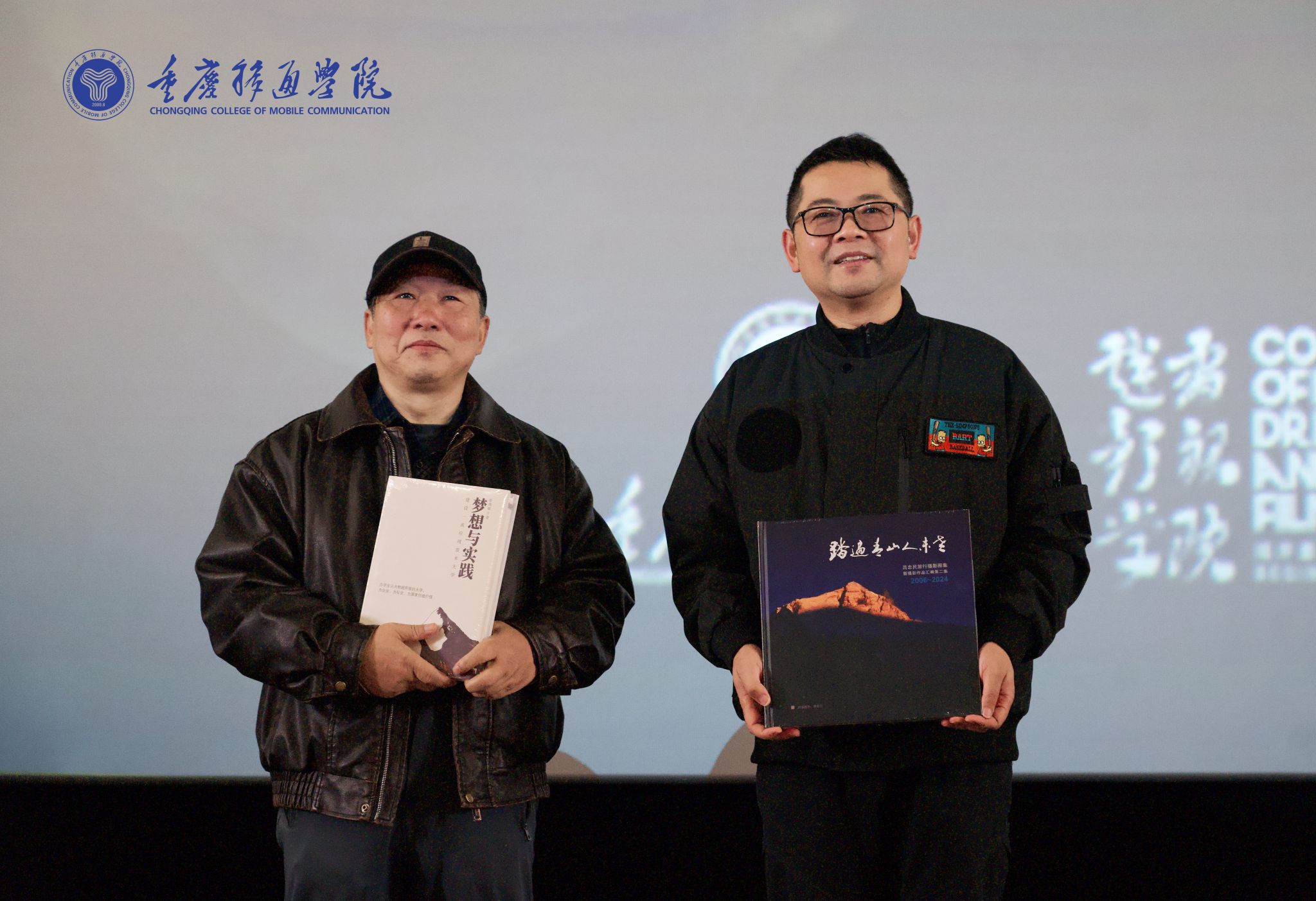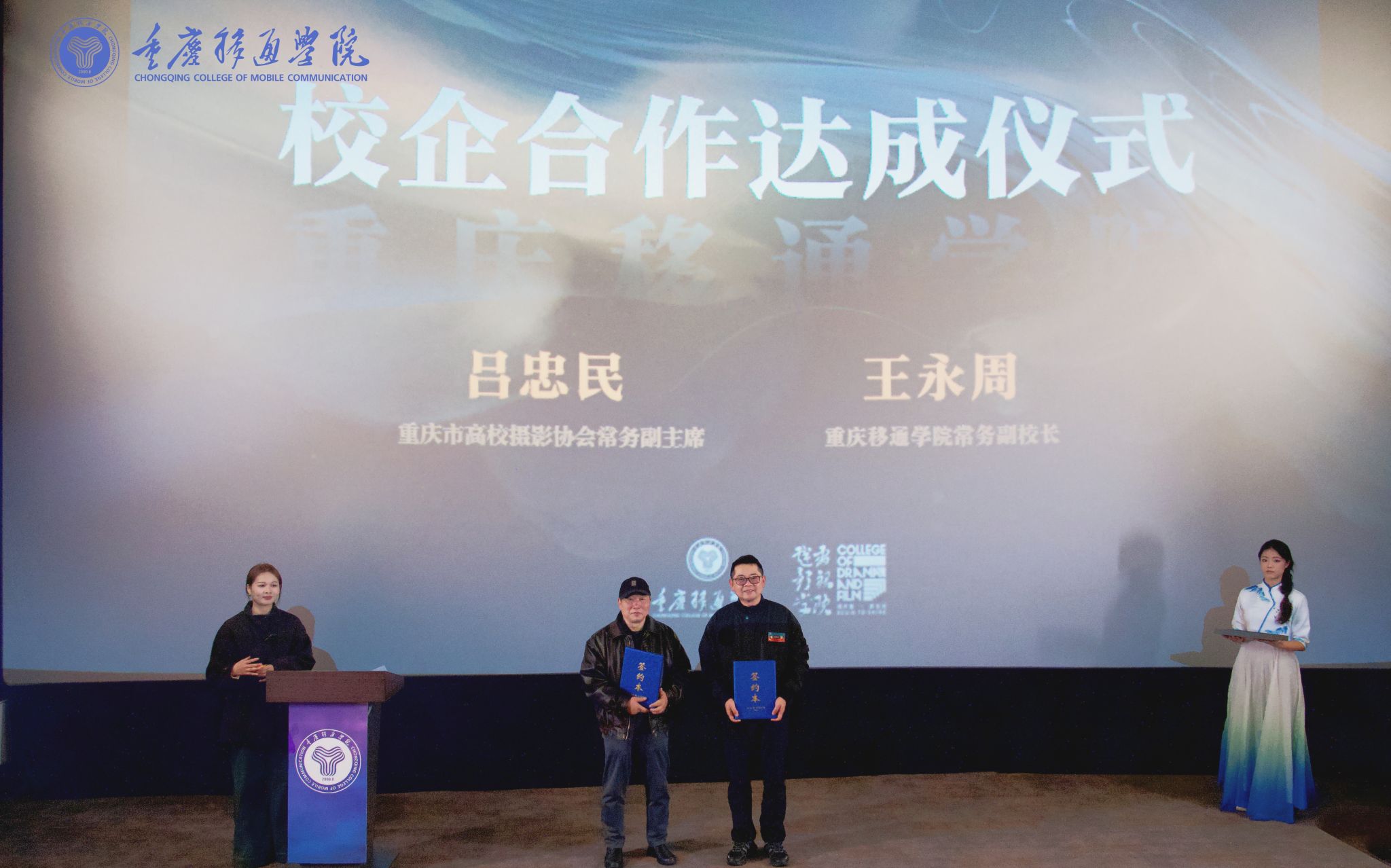 参与此次校企合作达成仪式的重要领导有:重庆市高校摄影协会常务副会长吕忠民、秘书长严金,重庆移通学院常务副校长王永周、戏剧影视学院副院长王芳、影视工程教研室主任秦琦琅。活动现场气氛庄重热烈,校企合作达成仪式盛大开展。王永周副校长与吕忠民副会长郑重见证了校企合作达成仪式。达成仪式后,王永周副校长与吕忠民副会长互赠了《梦想与实践》和吕忠民副会长个人影集《踏遍青山人未老》,此举彰显了重庆移通学院与重庆市高校摄影协会强调实践与应用、关注完满人格与综合素养、联结自然科学与人文社会科学的理念共识,表现出双方在育人举措与文化认知层面的高度共识与深度合作路径。