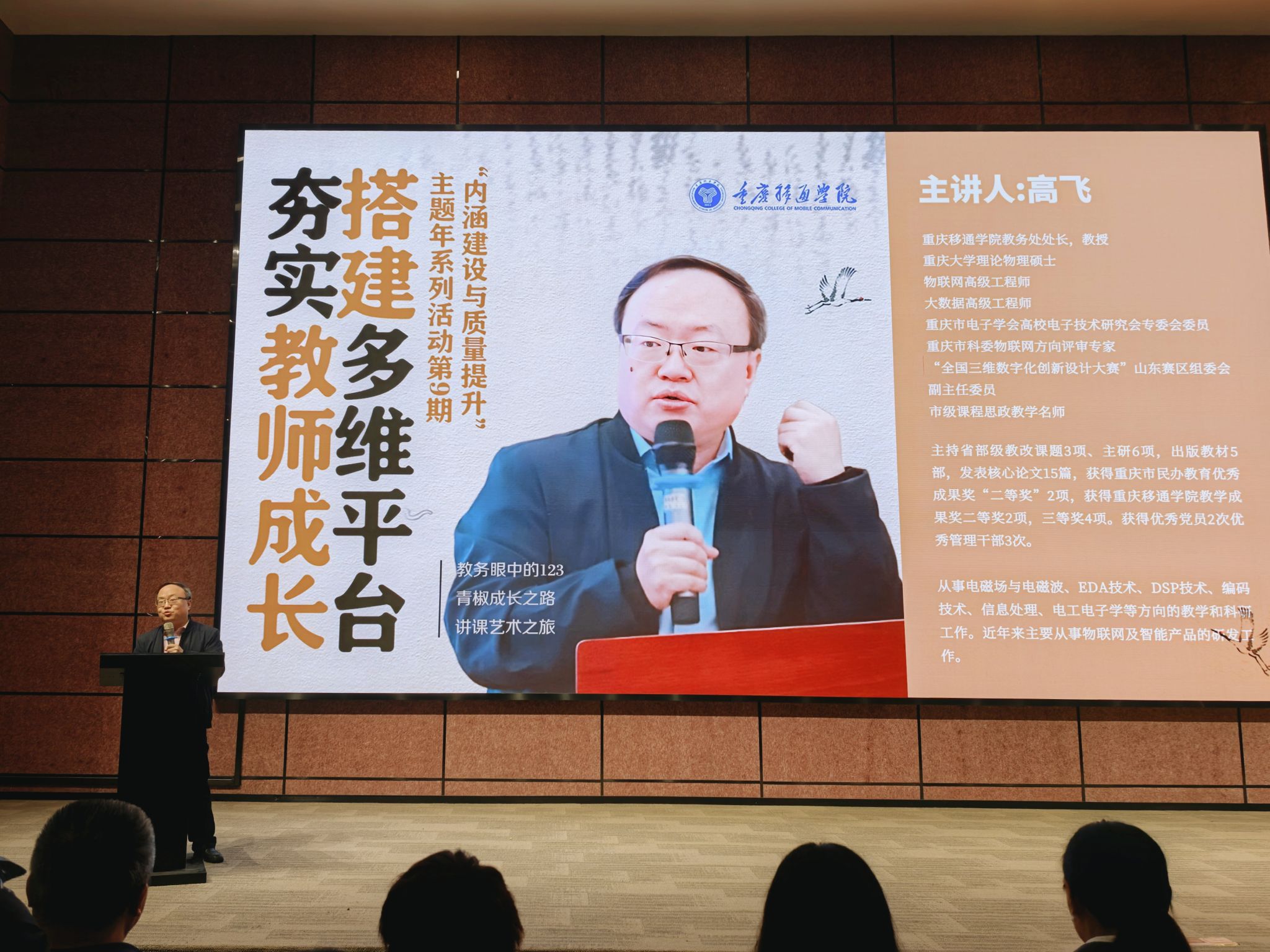 讲座伊始,高飞教授首先描绘了重庆移通学院的教育生态画卷。从学校设立的多元化二级学院、涵盖广泛的专业领域,到汇聚国内外优秀学者的强大师资阵容,每一处都彰显了学校对教育质量的执着追求和对教育创新的深刻理解。高飞教授提出的师资队伍建设策略,不仅着眼于教师队伍的数量增长,更注重其质量的飞跃,旨在构建一个充满活力、开放包容、协同创新的教师成长生态系统,为学校的可持续发展注入不竭动力。