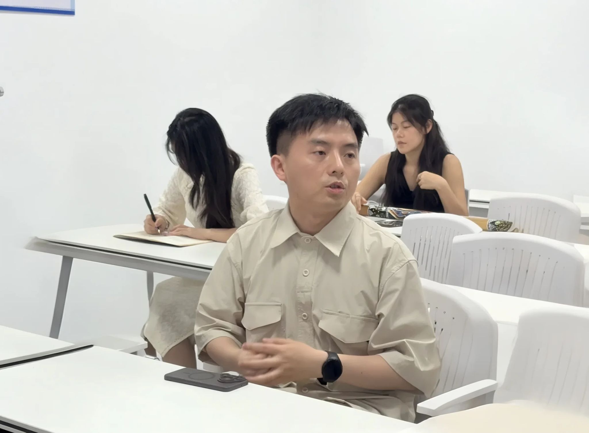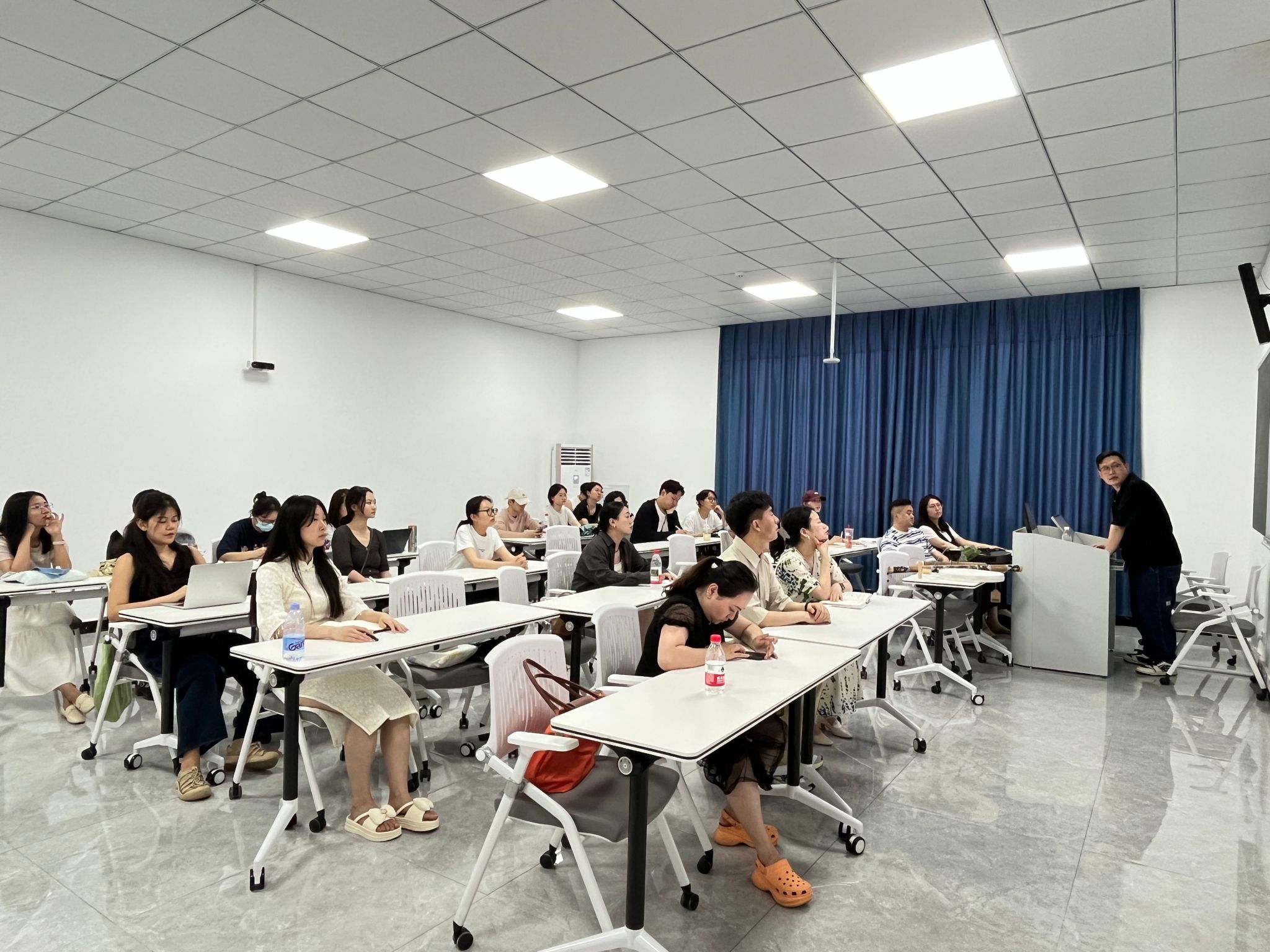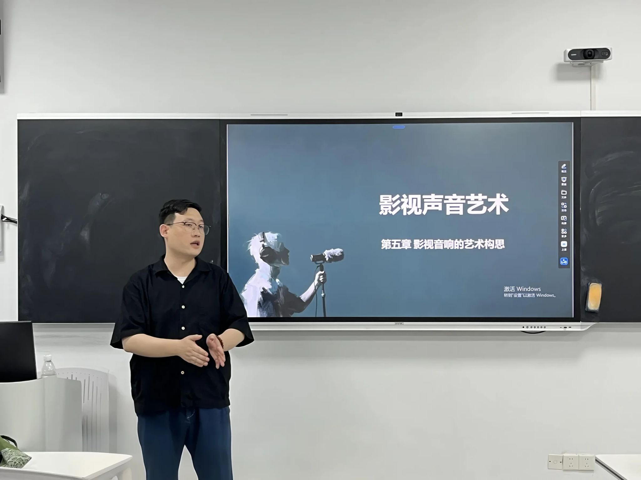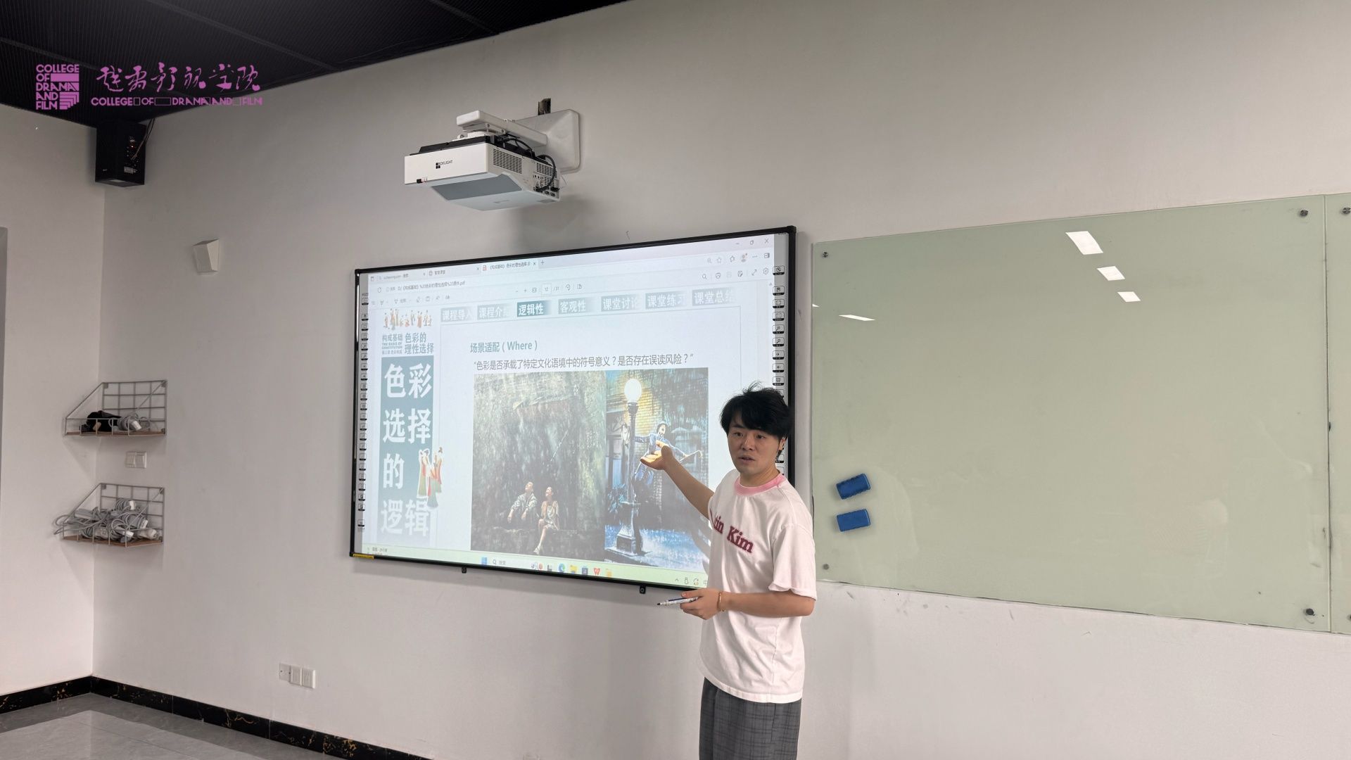 杨帆老师在内容导入部分,他以李白诗作《乌夜啼》为切入点,巧妙引入“音响”这一核心概念。李如冰老师将抽象的色彩的象征意义运用了传统的非遗漆扇来呈现,让学生感性地体验色彩。周极老师以同学们的日常创作为出发点,结合优秀影片案例和同学们的创作素材,系统解析了大家创作过程中的痛与难。郭嘉琦老师以当下电影发展存在的问题入手,追溯电影史中的宝贵经验,实现了以史为鉴的理念。熊琳老师以诸多IP打造的先进案例开场,分析了“哪吒”等IP中的中国文化元素。杨永欣老师结合经典影视作品中的构图设计,结合即梦AI生成动态构图范例,引导学生对比分析对称/失衡构图的情绪差异和叙事作用。邬眉扬老师将诸多故事文本的共性进行了梳理,引导同学们自己挖掘当下观众喜闻乐见的故事模型。