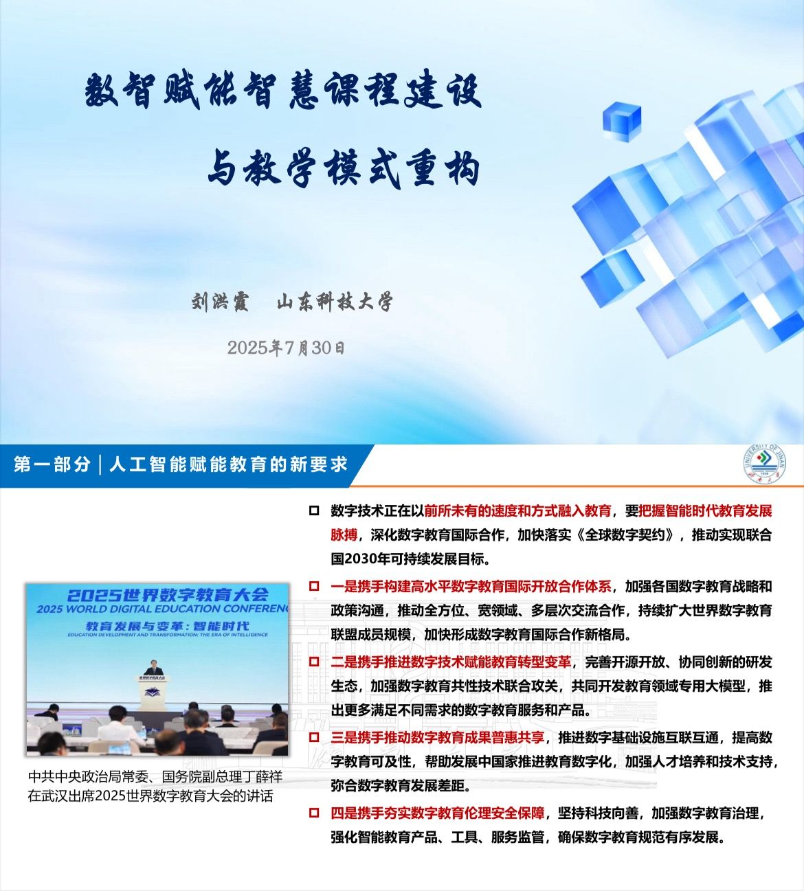 培训围绕智慧课程建设全流程展开,特邀三位国内知名专家进行专题分享。北京大学朱郑州副教授以《智慧课程建设与案例分享》为题,系统梳理了智慧型教师素养、学生潜质识别、课堂结构设计等关键环节,并结合知识图谱与AI助教开展实操演示,帮助教师理解技术如何深度赋能教学。济南大学丁广乾副教授聚焦《数智技术赋能智慧课程建设与教学创新实践》,从政策背景、课程思政、AIGC教育应用等维度,分享了其在智慧课程建设与多项教学竞赛中荣获一等奖的实战经验,提供了可复用的建设路径与申报策略。山东科技大学刘洪霞教授则以国家级一流课程《线性代数》为例,深入解读智慧课程的教学评价、质量优化与成果凝练方法,为参训教师指明了从课程建设到教学获奖的实现通道。