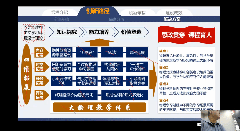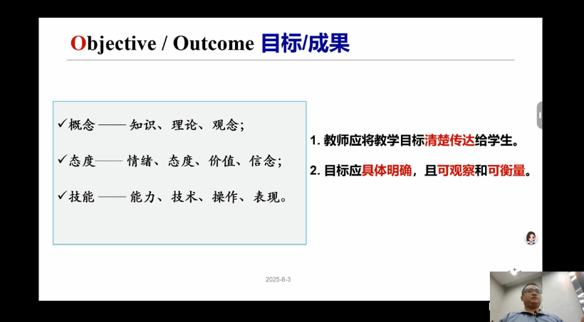 培训围绕高阶教学设计展开,涵盖教学比赛、教学设计方法、目标撰写、课程思政、AI工具应用等多个关键领域。在教学比赛板块,详细介绍了青教赛和教创赛的赛事信息,包括青教赛的分组情况、参赛流程、所需准备材料以及国赛推荐机制,教创赛的评分标准和各阶段时间安排等,让郭嘉琦老师对教学赛事有了清晰认知,为今后参与相关比赛明确了方向。教学设计方法方面,培训介绍了RACE、BROKE等提示语框架,助力明确教学任务的角色、背景和期望;五星教学原理从聚焦问题、激活旧知等五个维度,结合理论依据提供了丰富的工具集;BOPPPS模式则包含导入、目标等六个环节,每个环节都有具体操作方法,为课堂教学搭建了清晰框架,这些都让郭嘉琦老师对教学设计有了更系统的理解。尤其在目标撰写部分强调了其对评估、教学和学习的指导作用,讲解了区分描述性与程序性知识、使用对应动词及态度目标撰写的方法,使教学目标更具体可操作。课程思政模块阐述了其意义价值,介绍了不同专业课程的建设要求、融入点和评价方法,为实现知识传授与价值引领统一提供了思路。
