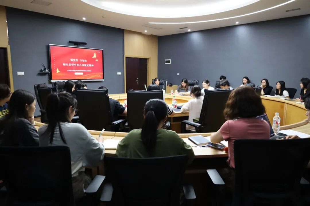 会上,全体同志观看《八项规定改变中国》主题教育片,联系思想和工作实际开展交流和研讨。学生党支部林倩以刹住“四风”·防止“疲劳综合征”为主题,剖析高校党风廉政及作风建设的重要意义。教师党员熊琳以及学生党员周龙琪、沈奇分别从自身岗位职责出发,分享了在工作过程中严守规范、务实创新的经验。