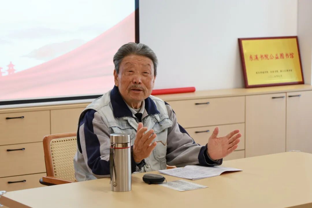 本次主题党日活动特别邀请到东溪镇原文化站站长、綦江区版画研究会副会长、中国版画家协会会员何星国同志参与其中,82岁高龄的何星国同志重点讲解了东溪古镇作为国家级文化名镇的红色历史,包括1926年东溪米案、与邓小平同赴法国勤工俭学的革命先辈罗振声等事迹,生动再现了本土革命先辈为信仰奋斗终身的崇高精神。除革命先辈外,何星国同志从自学诗书画、深耕农民版画、传承本土文化等自身经历出发,展现了作为共产党员的家国情怀与坚守担当。最后,何星国同志以186字原创对联串联起古镇景点与名人,将历史记忆与文化传承融为一体,让在座师生直观感受到綦江本土红色文化的历史厚度与精神内涵。