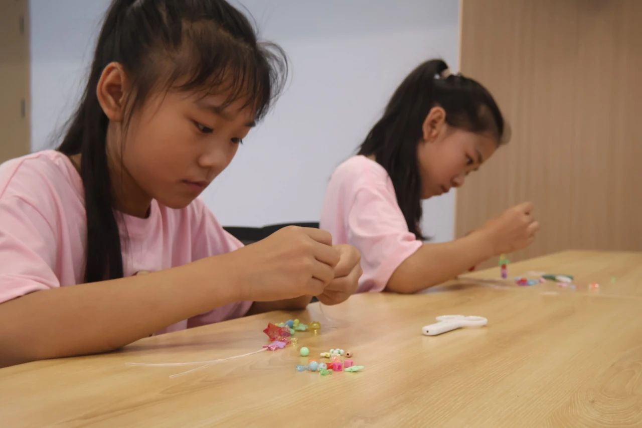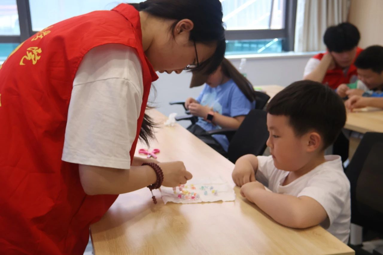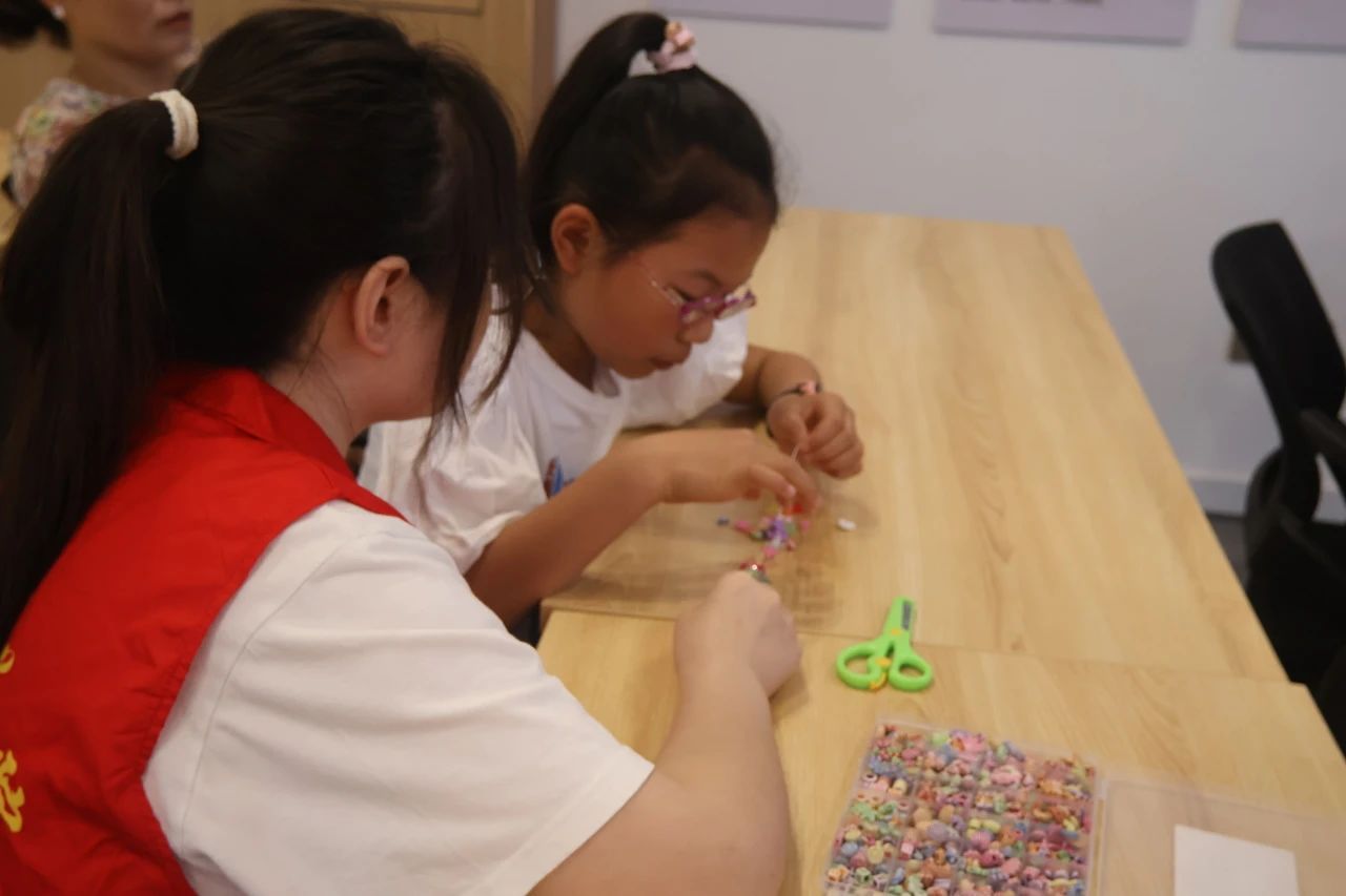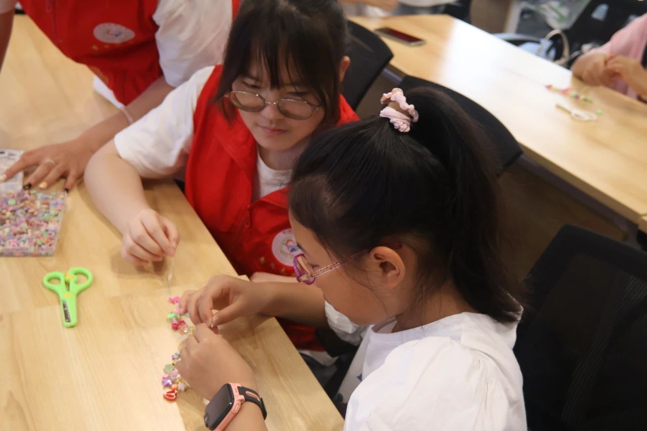 随后,志愿者们分组对孩子们进行一对一的串珠技巧指导。“先把弹力线穿过珠子,然后拉紧,就像这样。”志愿者轻声细语地教导着。孩子们聚精会神,小手小心翼翼地摆弄着珠子,尝试将不同颜色、形状的珠子组合在一起。有的孩子想要制作一条送给妈妈的爱心手链,有的则想给自己做一串充满梦幻色彩的手链。在创作过程中,遇到困难的孩子会向志愿者求助,志愿者总是耐心地给予帮助,鼓励他们大胆发挥想象。