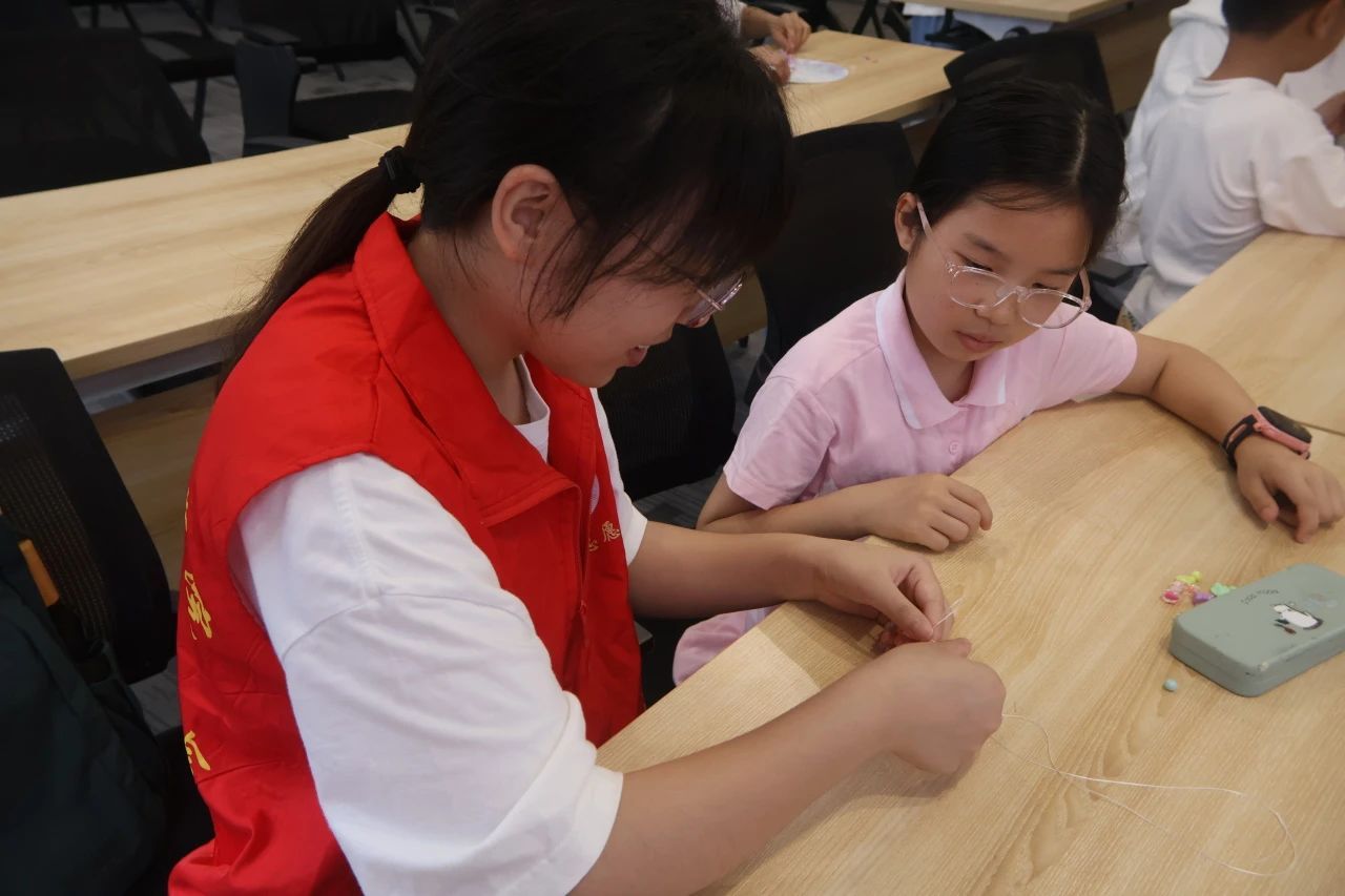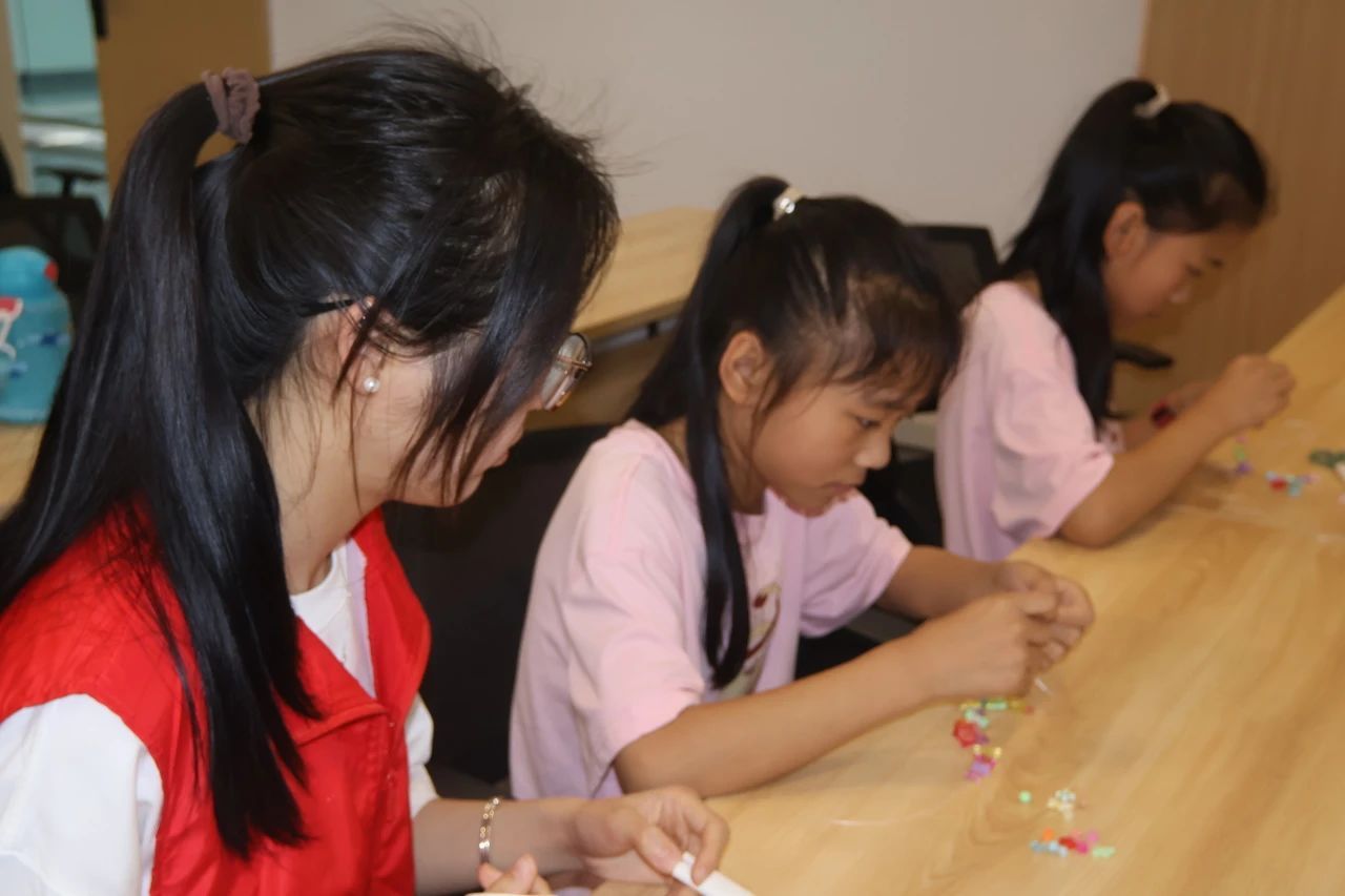 志愿者们精心准备了色彩斑斓的串珠、弹力线等材料。为了让孩子们迅速融入活动氛围,志愿者先进行了一场趣味十足的串珠知识小问答,“哪种颜色的珠子最像天空呀?”“什么形状的珠子适合做花朵的中心?”孩子们踊跃举手,积极抢答,现场气氛热烈欢快,纯真的笑容绽放在每一个小脸上。