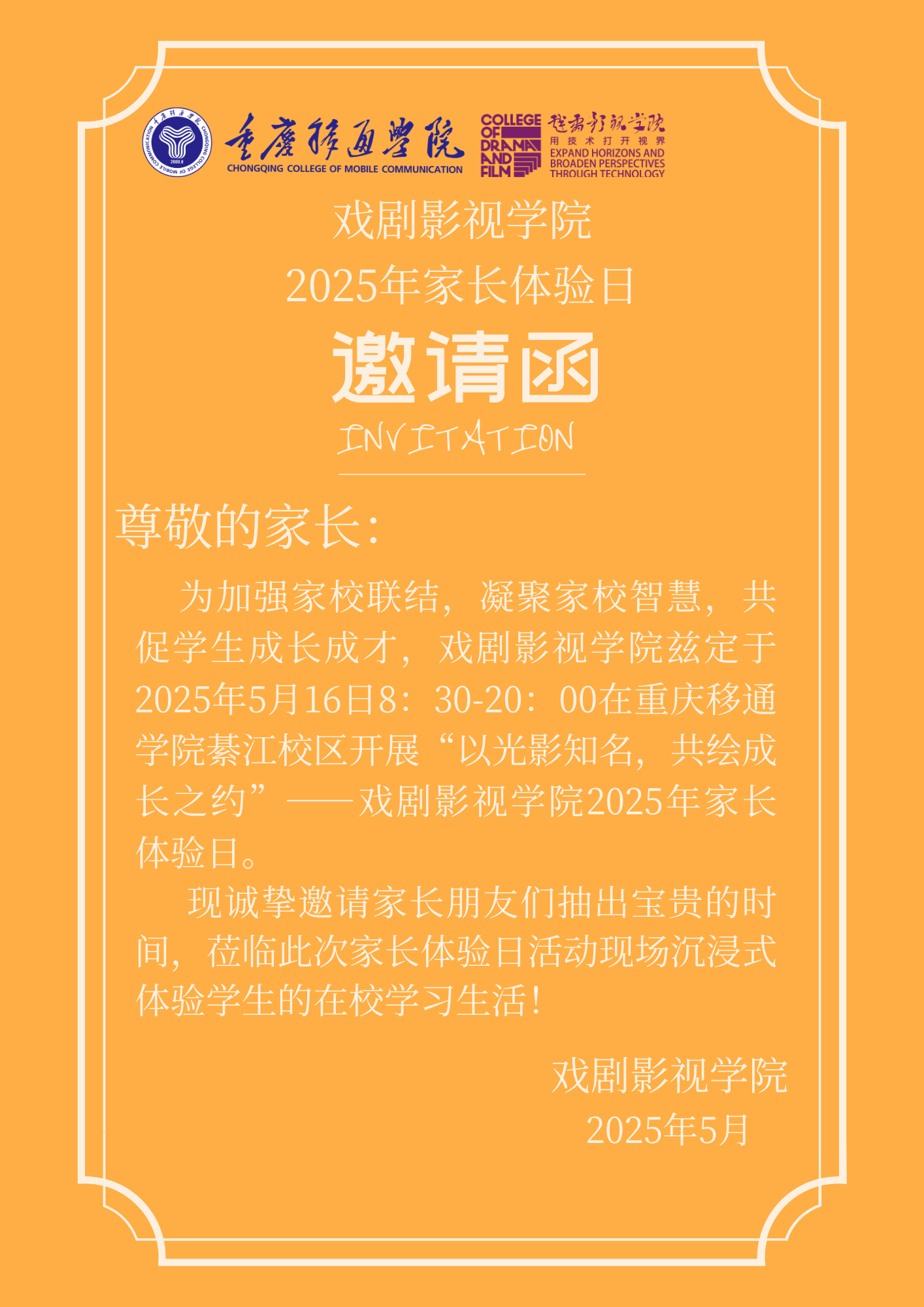 在教育的长河中,学校与家庭的携手同行至关重要。为进一步强化学校、家长、教师间的交流互动,让家长们踏入校园,深入课堂,亲身体验戏剧影视学院独特的教育教学模式。戏剧影视学院将于2025年5月16日举办 “以光影知名·共绘成长之约”——戏剧影视学院2025年家长体验日。我们诚邀各位家长拨冗莅临,一同参与这场意义非凡的活动,共同为孩子的成长助力。期待在活动中与您相遇,共赏戏剧影视之美,共话孩子的未来!