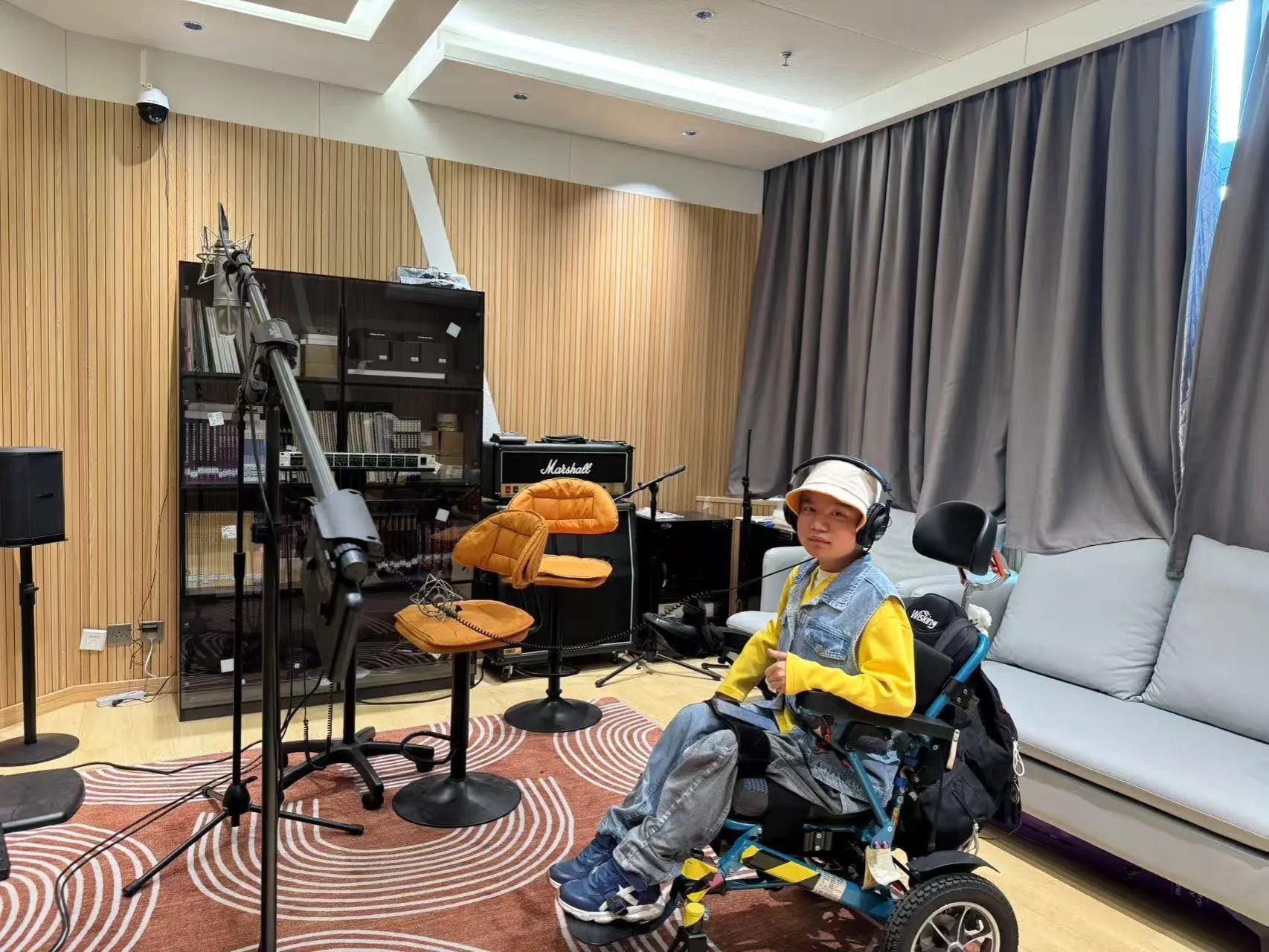 (罗睿燊在学校录音棚录制歌曲)