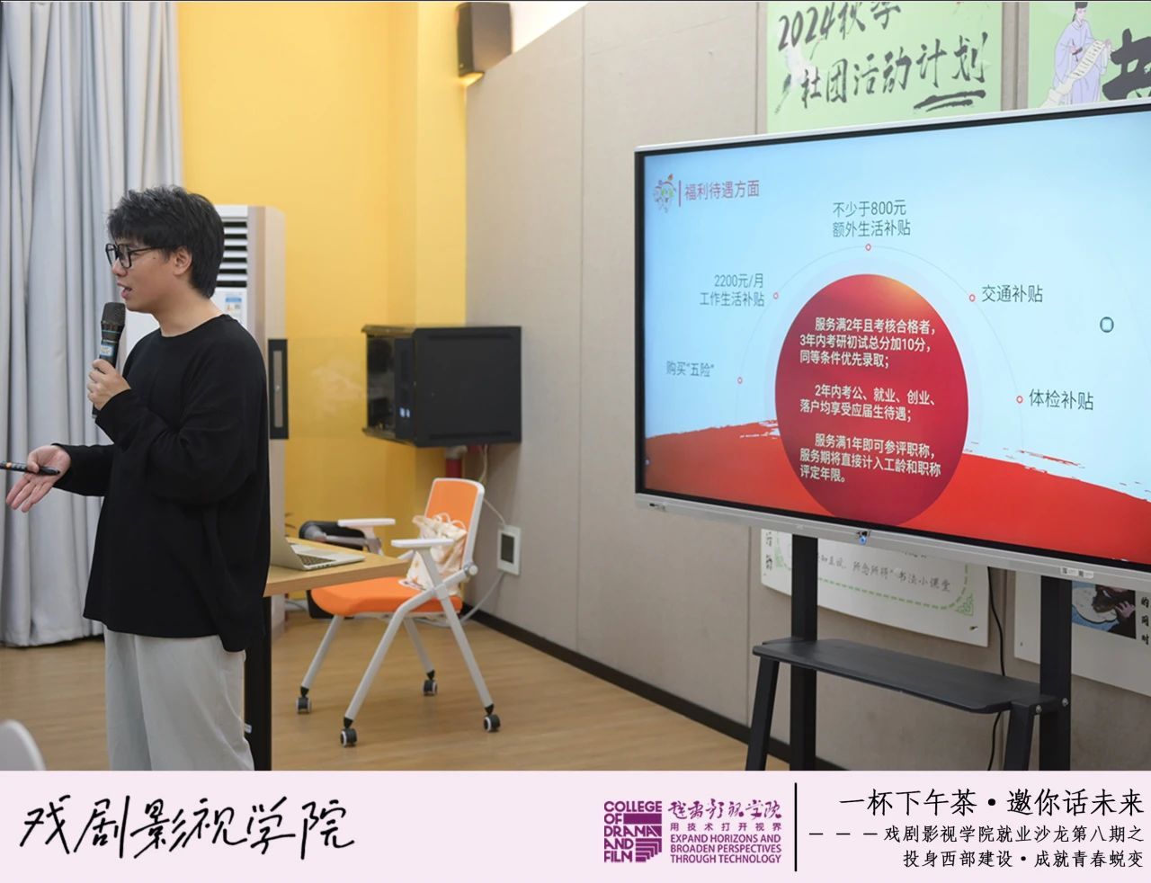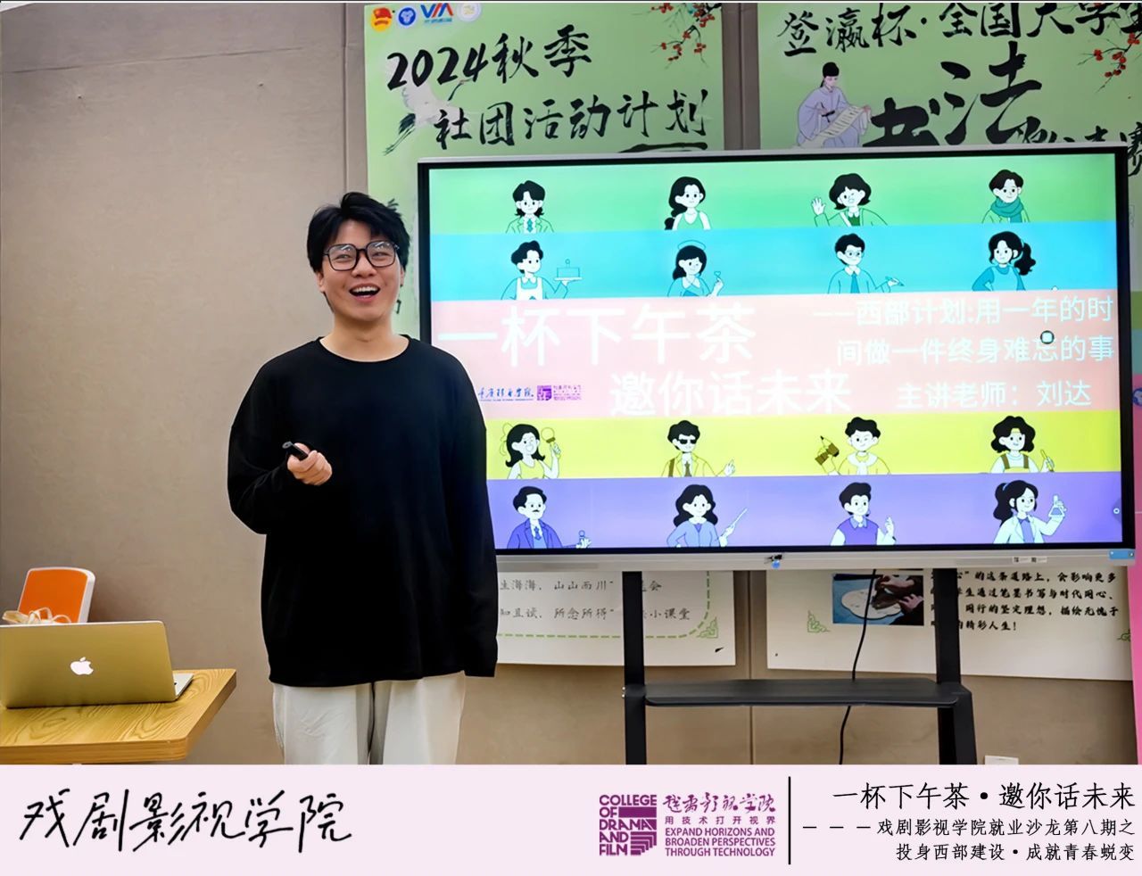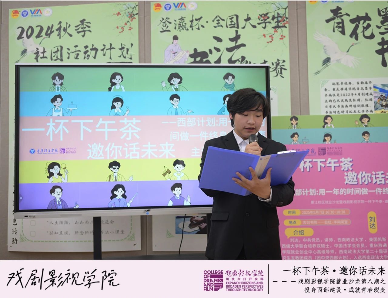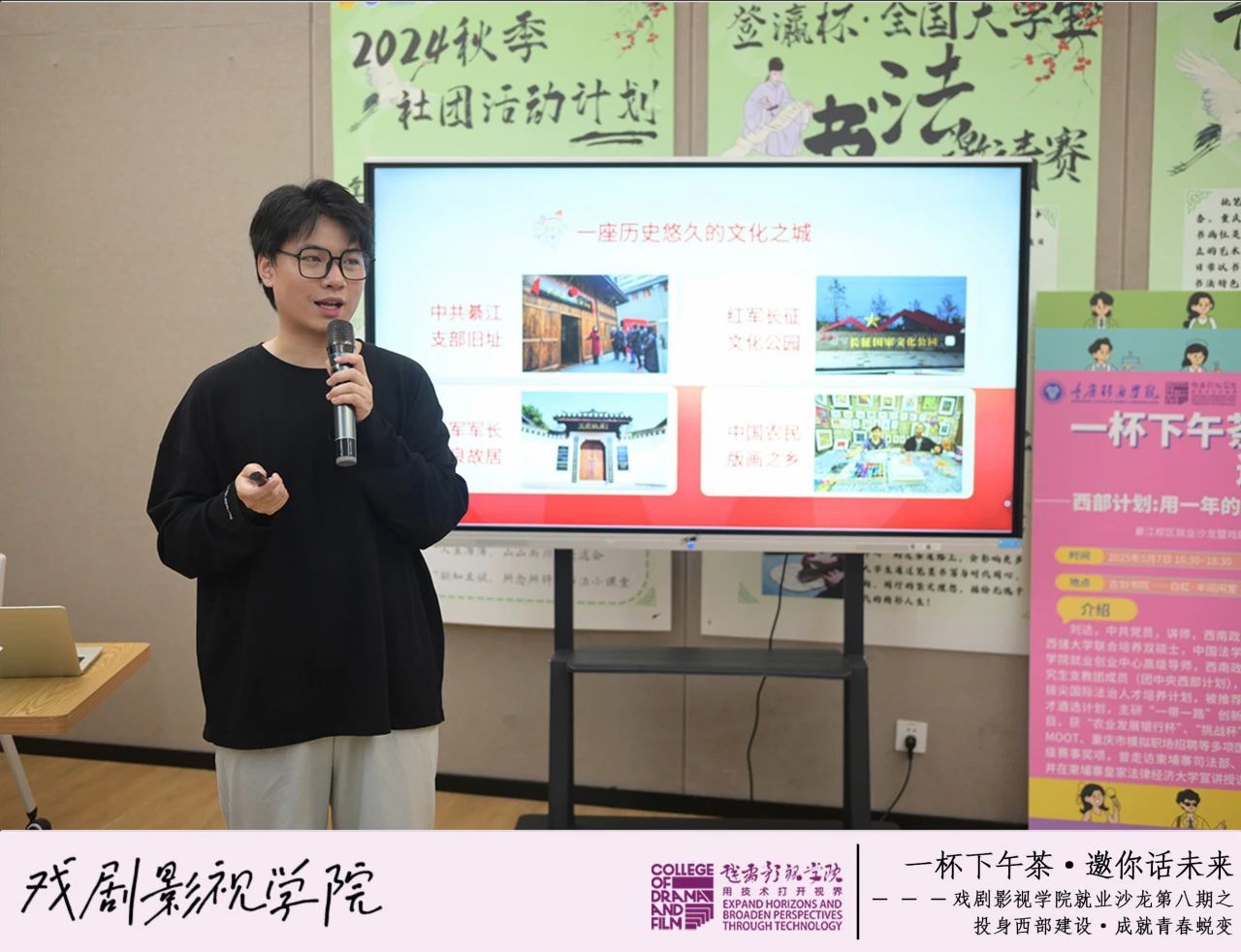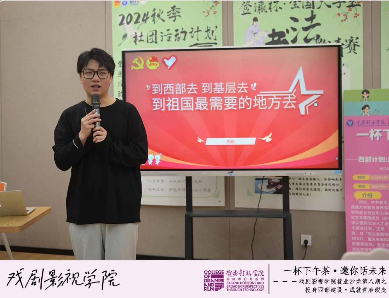 为深化青年学子对西部计划的认识,鼓励更多学生投身西部基层建设,5月7日下午,戏剧影视学院在瀛溪书院很正式研讨室举办“‘一杯下午茶·邀你话未来’之投身西部建设·成就青春蜕变”就业沙龙。本期活动特邀重庆移通学院就业创业中心高级导师、西南政法大学与美国凯斯西储大学联合培养硕士刘达老师担任主讲嘉宾,以“西部计划”为主题,根据政策解读与亲身经历,为70名戏娃们带来一场关于青春选择与价值实现的分析与交流。本活动由戏剧影视学院2024级动画3班袁鑫睿同学主持。