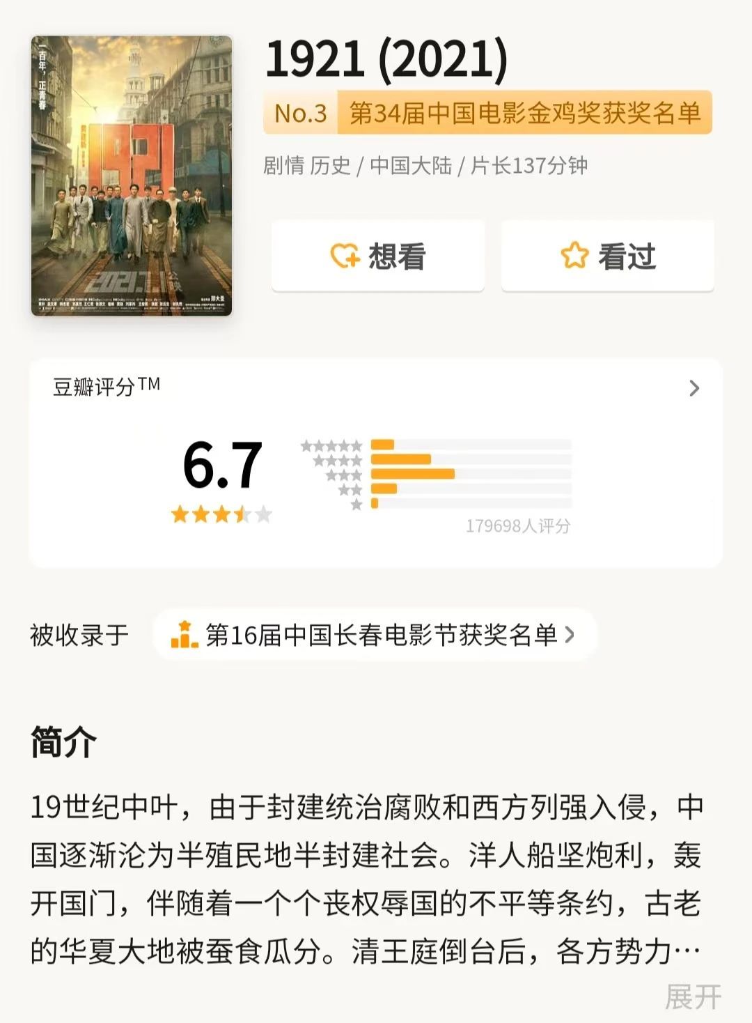 小戏影评:《1921》作为建党百年的献礼之作,将那段开天辟地的历史鲜活呈现。影片以独特视角聚焦中共一大的筹备与召开,从李达夫妇等人物切入,在风云激荡的时代背景下,展现出首批共产党人的热血与担当 。