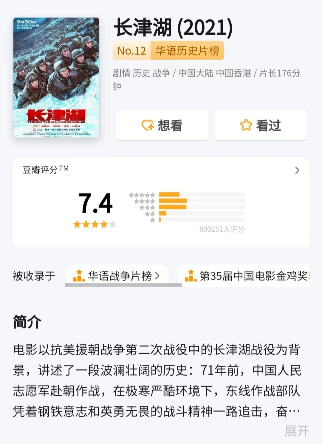 简介:《长津湖》以抗美援朝战争第二次战役中的长津湖战役为背景 。讲述了中国人民志愿军第九兵团七连等部队,在极寒严酷环境下,克服后勤补给严重不足、装备落后等困难,与美军展开殊死搏斗。志愿军战士们凭借钢铁意志和英勇无畏的战斗精神,成功分割包围美军,全歼美军“北极熊团” ,将以美国为首的联合国军从鸭绿江边赶回三八线,扭转了战场态势,为抗美援朝战争的胜利作出重要贡献 。影片刻画了伍千里、伍万里等众多鲜活的志愿军人物形象,展现了他们保家卫国的坚定信念和舍生忘死的崇高精神。