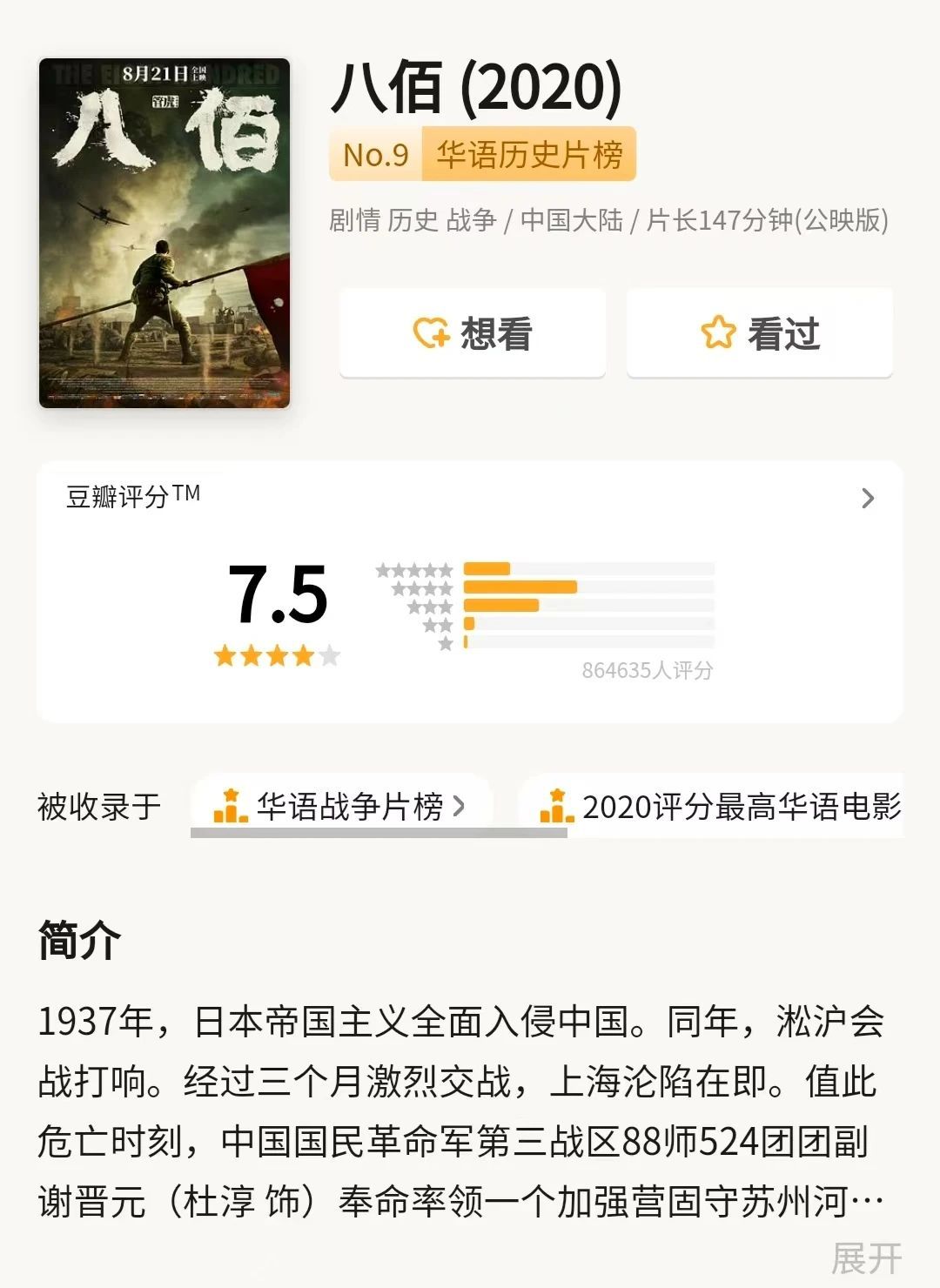 简介:《八佰》改编自1937年淞沪会战期间的四行仓库保卫战,讲述了史称“八百壮士”的中国国民革命军第三战区88师524团的一个加强营,固守苏州河畔的四行仓库、阻击日军的故事。