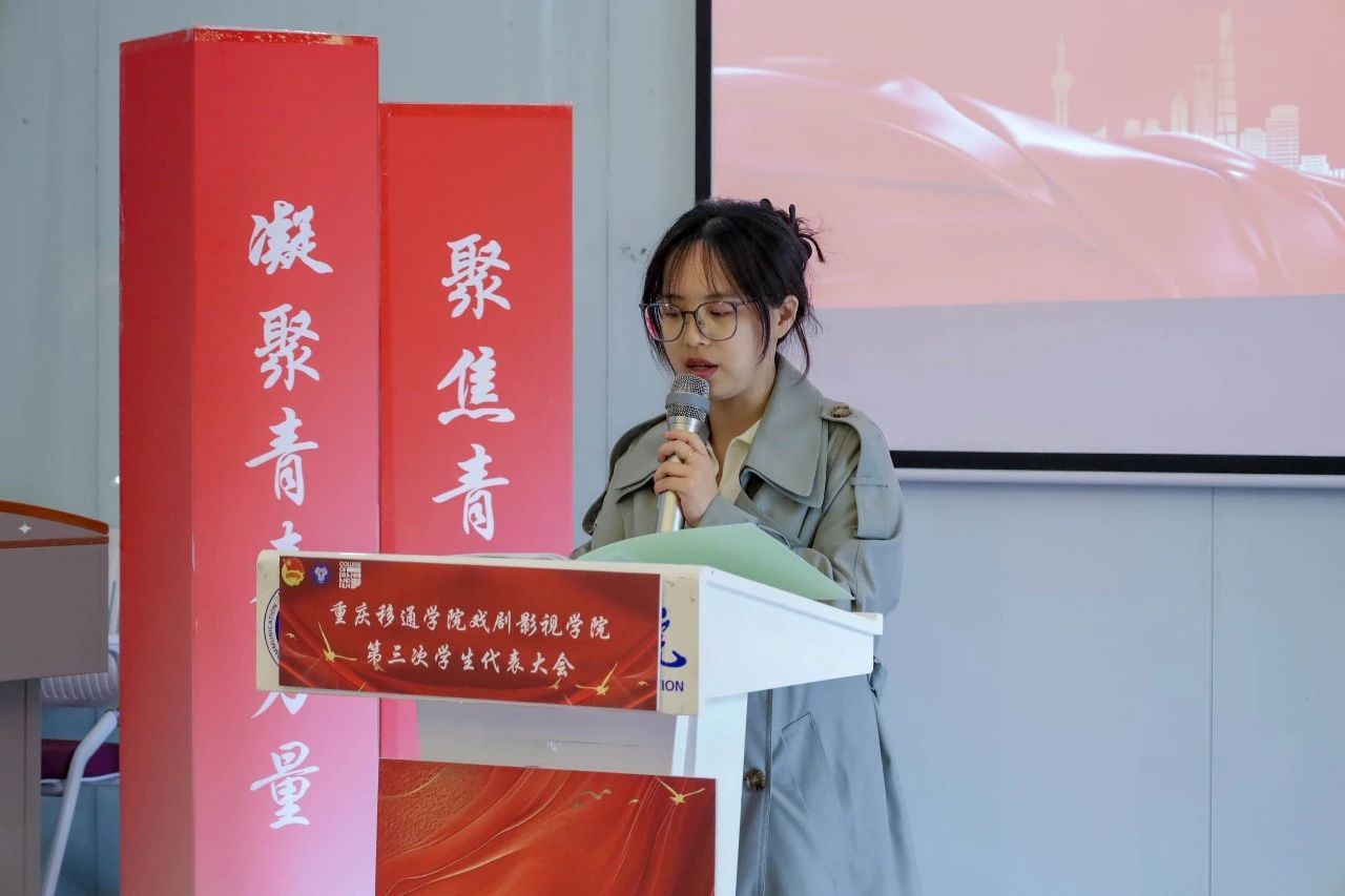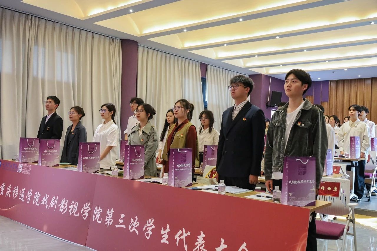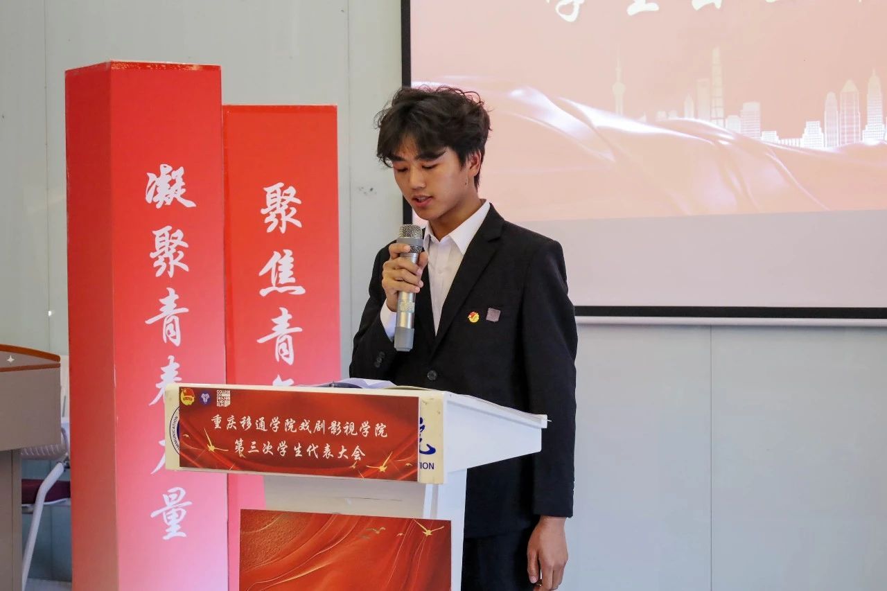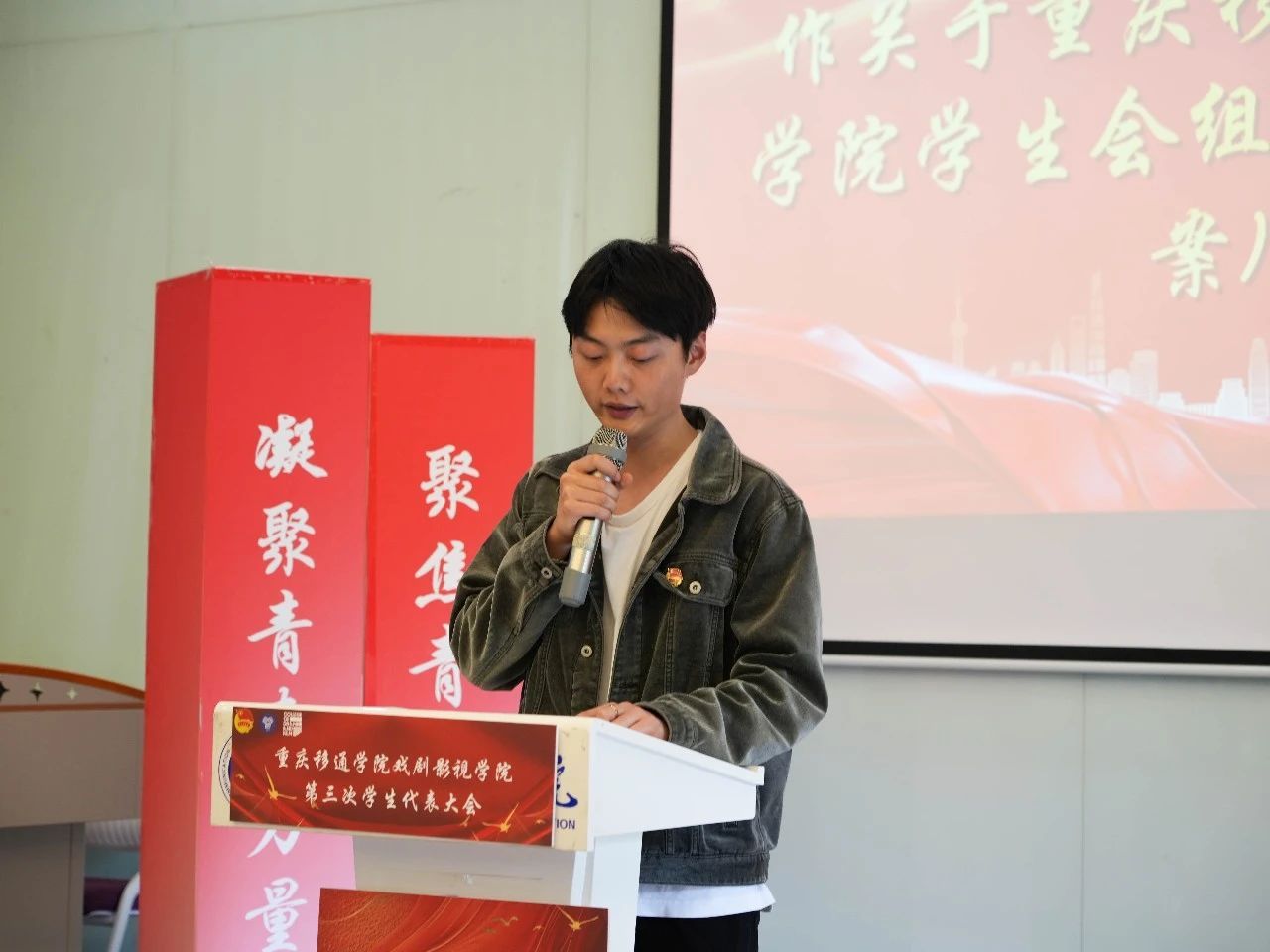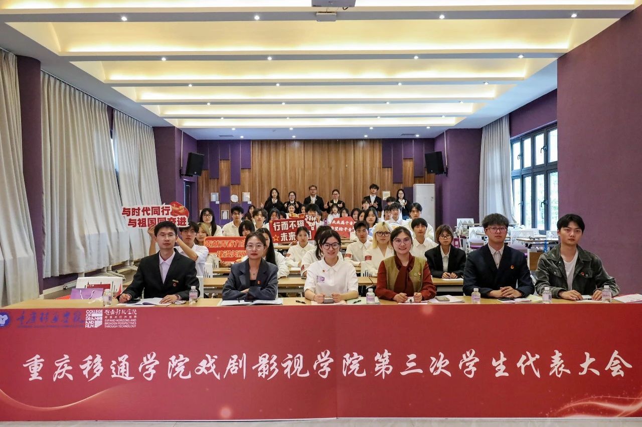 青春遇华年,奋斗启新篇。2025年4月23日16:00,重庆移通学院戏剧影视学院第三次学生代表大会在观云书院冬至·多媒体教室顺利召开。重庆移通学院校团委学生会指导老师曹誉莹,戏剧影视学院学生党支部书记、学工办主任曾玉娇,戏剧影视学院各活动版块指导老师,辅导员代表及34名学生代表参与大会。