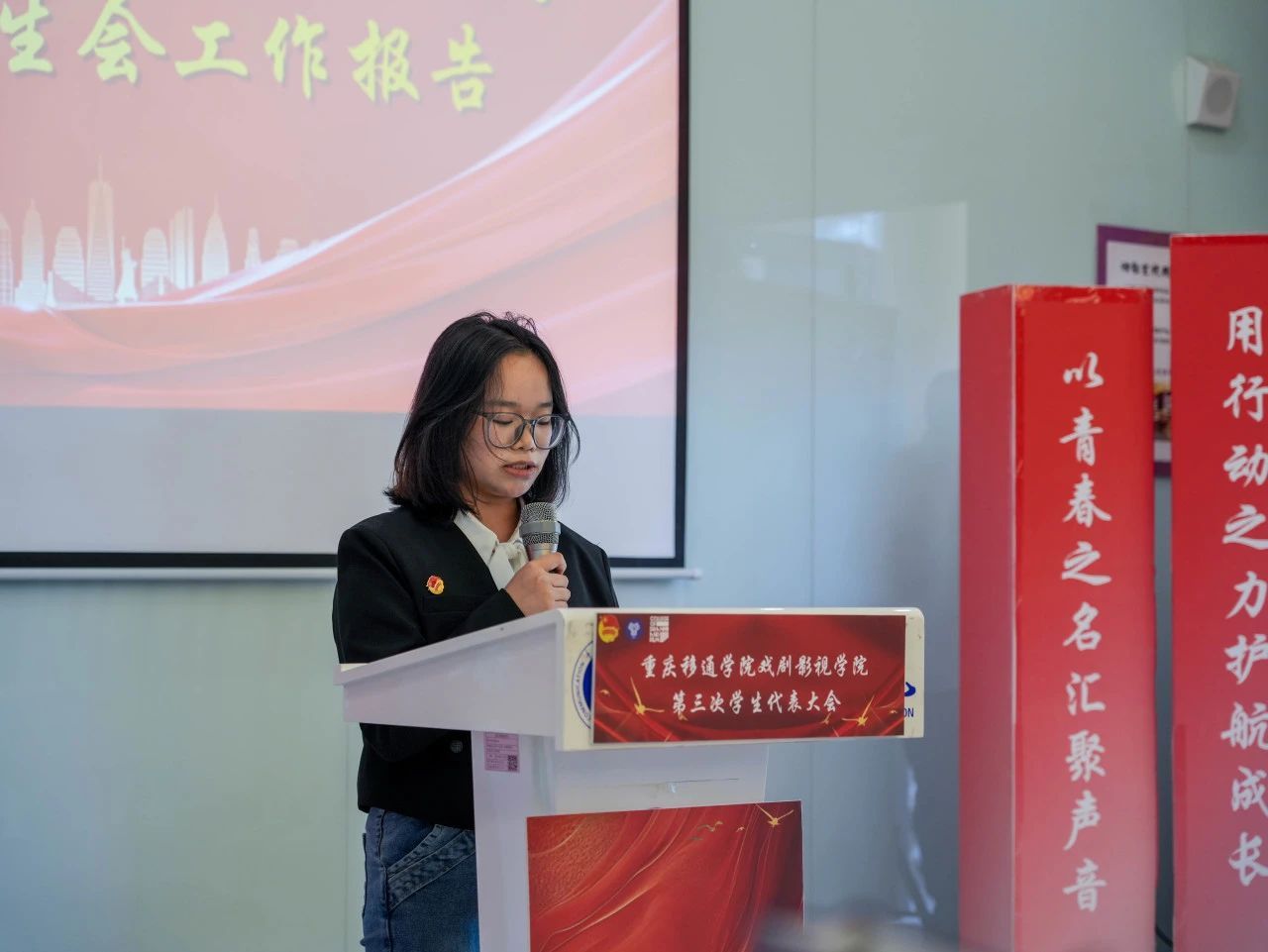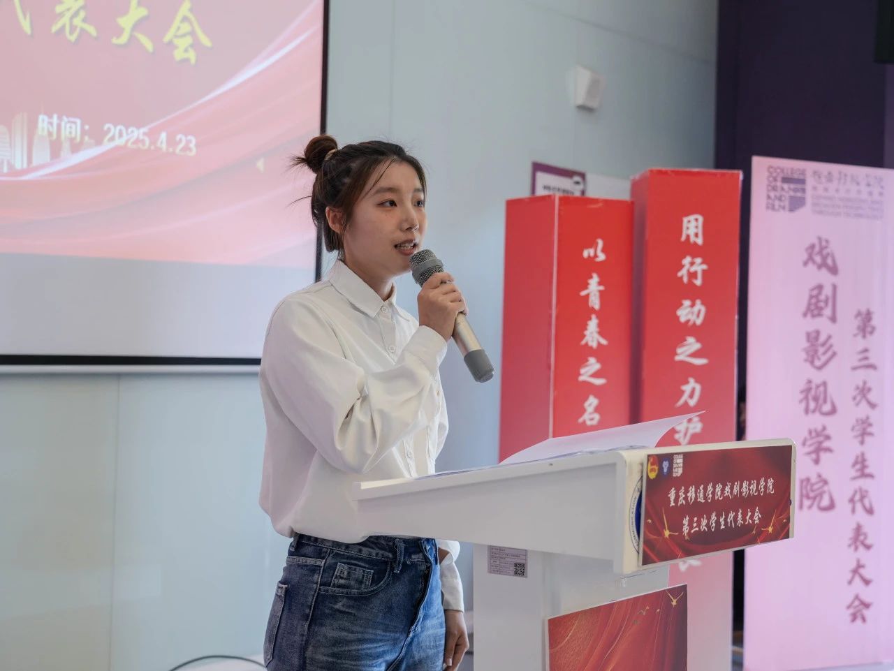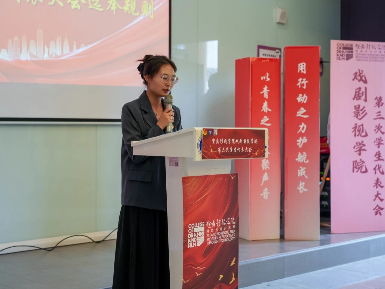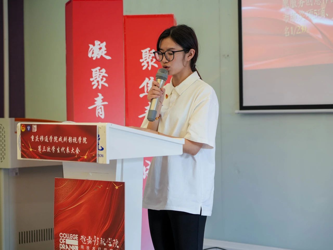 戏剧影视学院第二届学生委员会委员刘云秀同学作了《戏剧影视学院第二届学生会工作报告》,报告回顾第二次学代会以来的工作,在聚焦学生权益保障、品牌活动创新、思想引领深化、组织改革推进,展现学生会桥梁纽带作用,总结经验、直面不足。展望未来,呼吁新一届委员会继续传承服务精神,持续办实事、解难题,凝聚青春力量,在传承中创新,筑牢学生思想根基,为学校建设发展贡献青春力量。
