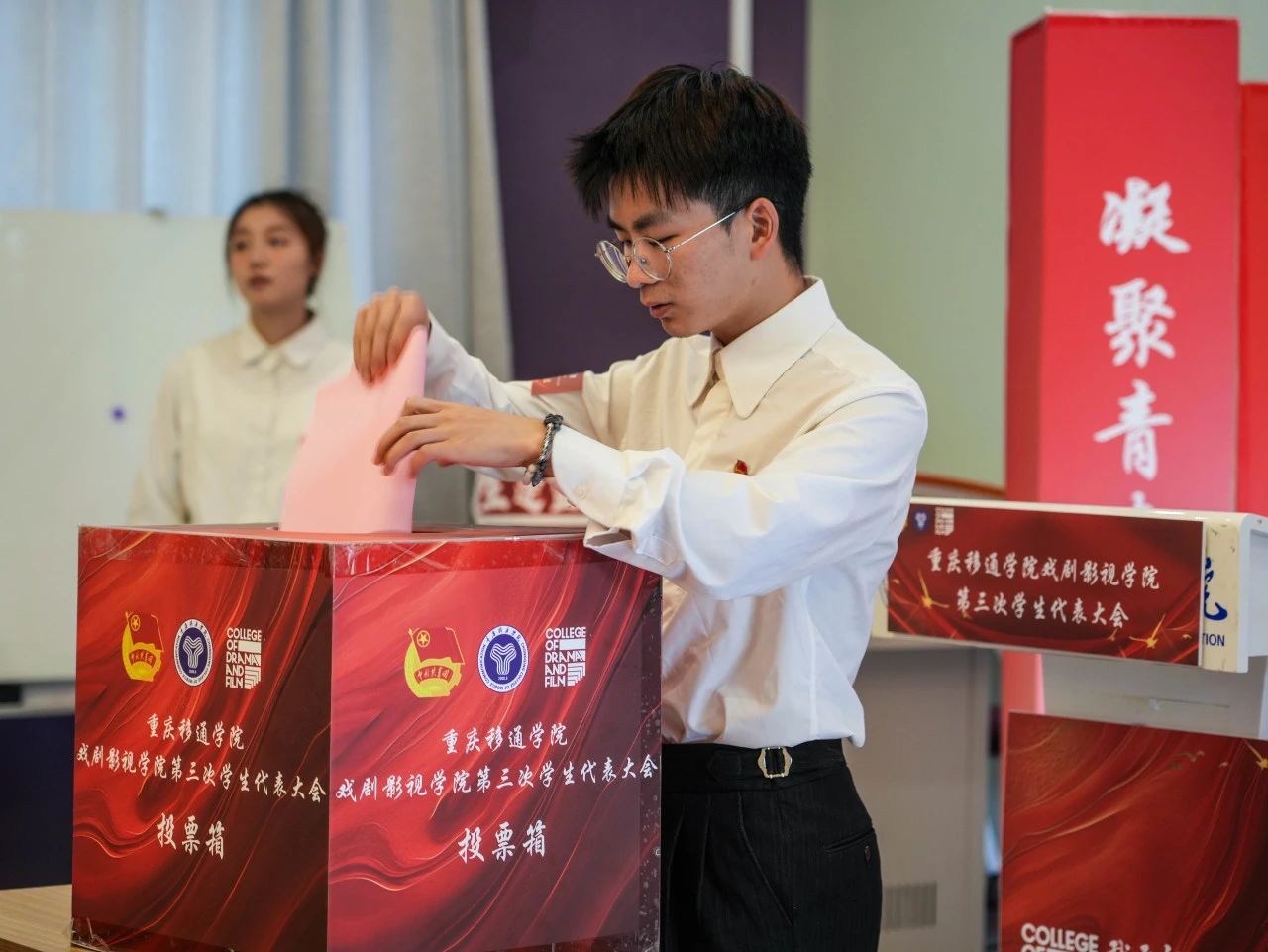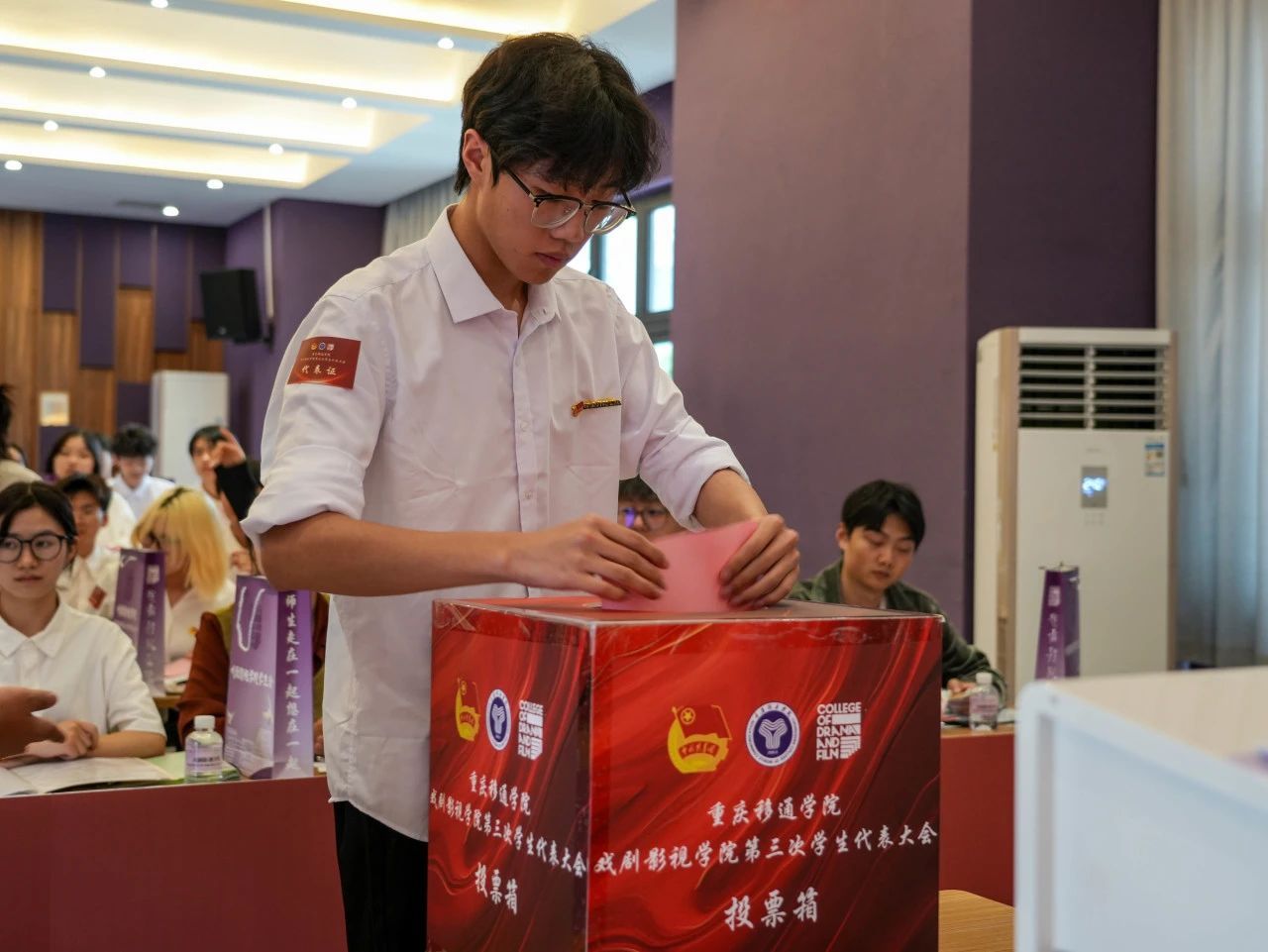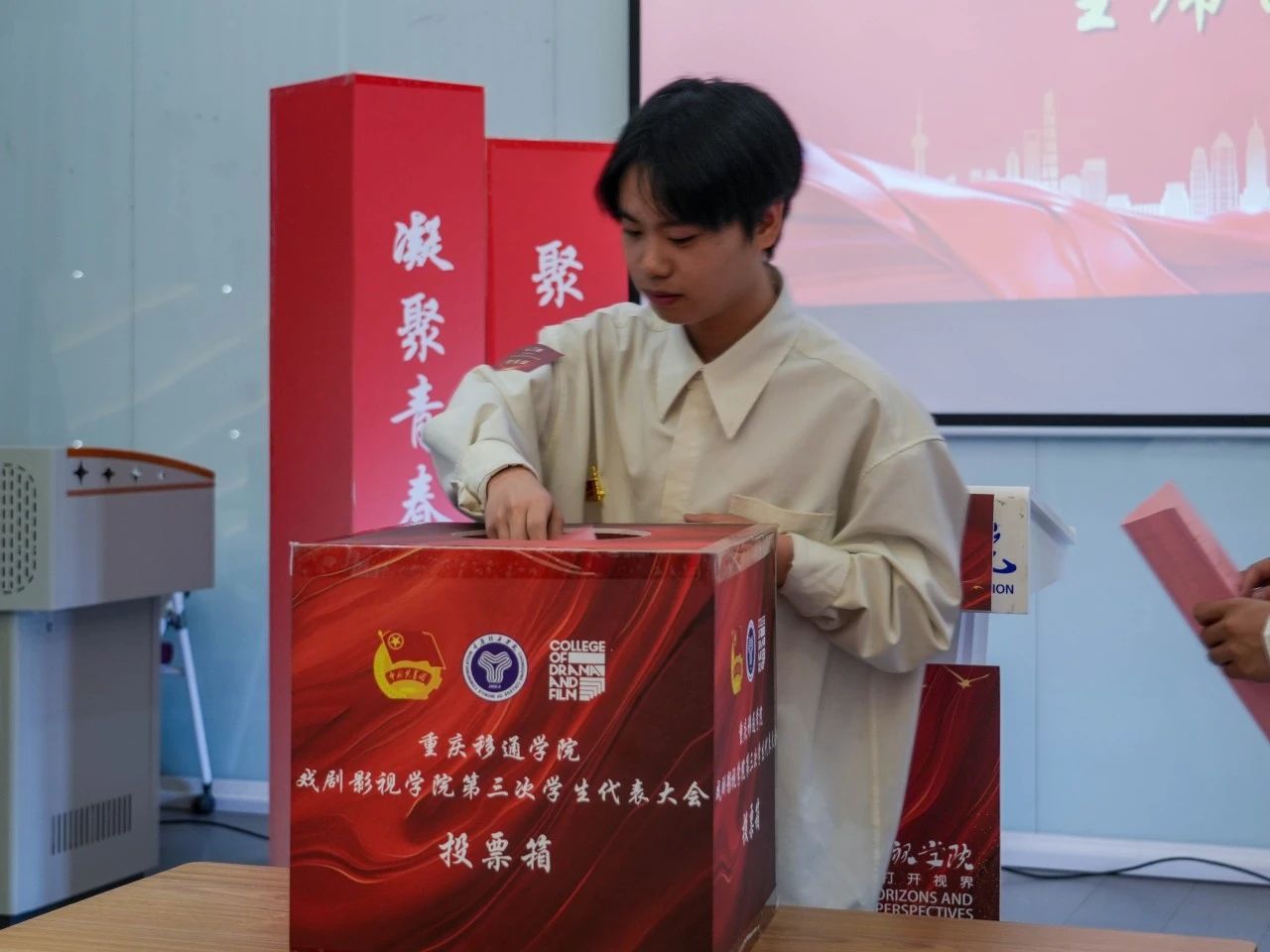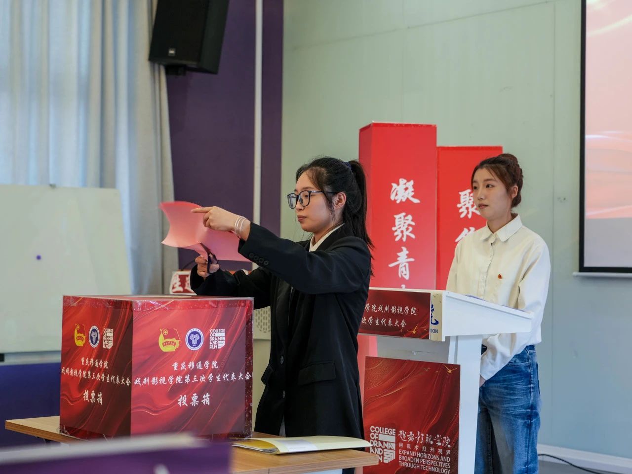 选举开始前,李梦雪同志宣读《重庆移通学院戏剧影视学院第三次代表大会候选人名单及简介》,各个学生代表认真查看候选人情况。选举秉承着公平公正公开的原则,以不记名纸质投票方式进行,在总监票人范元翠同学、总计票人殷瑞同学的严格监督下,全体代表依次投票。根据《大会选举办法》的规定和选举计票结果,赵天溢同志宣读《重庆移通学院戏剧影视学院第三次代表大会主席团成员名单》,最终,席瑾怡、王鹏飞、唐力、徐颜、李思千5名同学当选为重庆移通学院戏剧影视学院第三届学生会主席团成员。