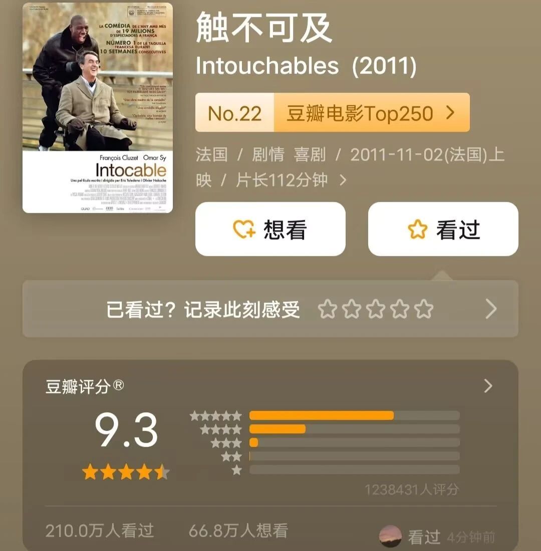电影通过菲利普和德里斯之间跨越阶层、种族和身体障碍的友谊,展现了人性中最温暖、最美好的一面。这种真挚的情感让我感受到人与人之间的理解、包容和关爱,给人以心灵的慰藉。