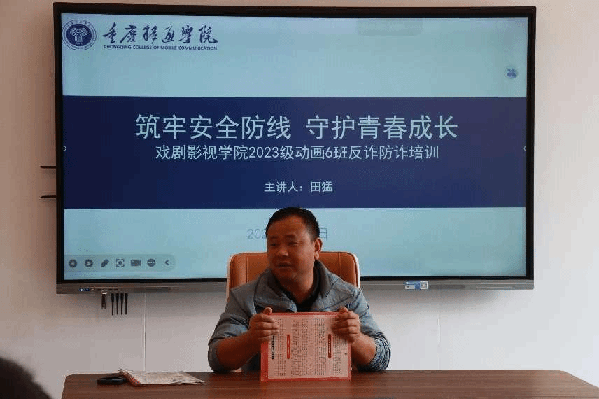 4月8日下午,在明善图书馆207会议室,一场别开生面的安全教育课正在进行。为增强学生安全意识,提升防诈能力,綦江校区学生处专任教师、戏剧影视学院动画6班和7班异科导师田猛,结合自身专项工作背景,为35名异科班同学带来了一场“反诈防诈+国家安全”专题培训。