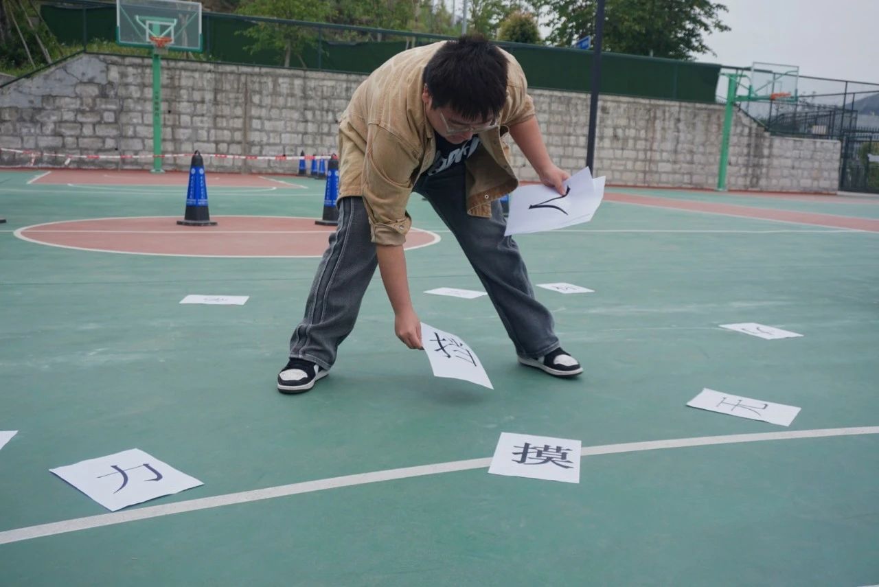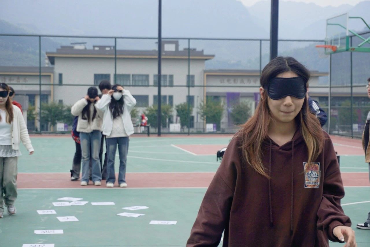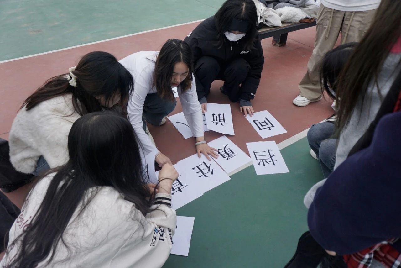 第二轮项目“盲拼竞速”,每支队伍10人参与,除队长外,队员均佩戴眼罩且禁止发声。队长以手搭肩指挥队员前进,首位队员需拾取散字拼凑语句。比赛现场,氛围紧张而充满信任:有的队伍凭借清晰指挥,快速规划路线,蒙眼队员步伐一致完成任务;有的队伍虽遇波折,却在调整中展现团结韧性。无声的赛场里,团队信任与智慧碰撞出火花,将“团结”二字诠释得淋漓尽致。经过激烈的比拼,其中有三支队伍在众多队伍中取得先机,第一组”完满小分队”通过手搭肩传递清晰指令,蒙眼队员步伐一致,快速拾起散字完成拼凑,展现出极强的团队执行力获得了9分,第二组”新时代”在无声中依靠日常训练的默契,即使路线不一样,但也能做出迅速反应,最终顺利完成拼字任务获得了6分,第三组”OKK”则以稳扎稳打的策略推进,在摸索中完成文字收集与拼凑。在无声赛场中,各队伍用不同方式诠释团队协作智慧,上演“心有灵犀”的精彩对决。