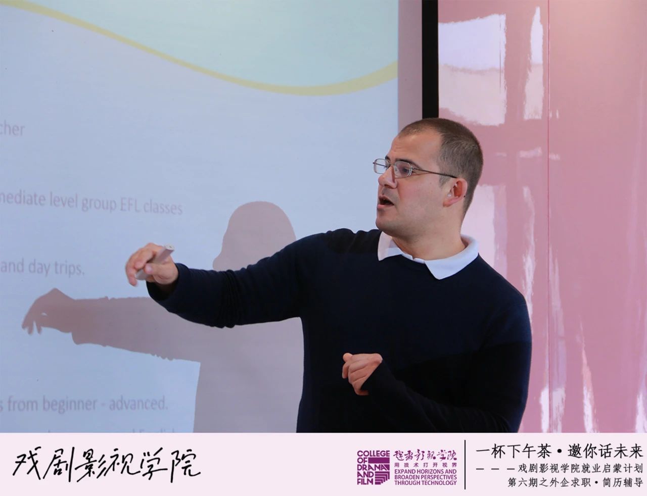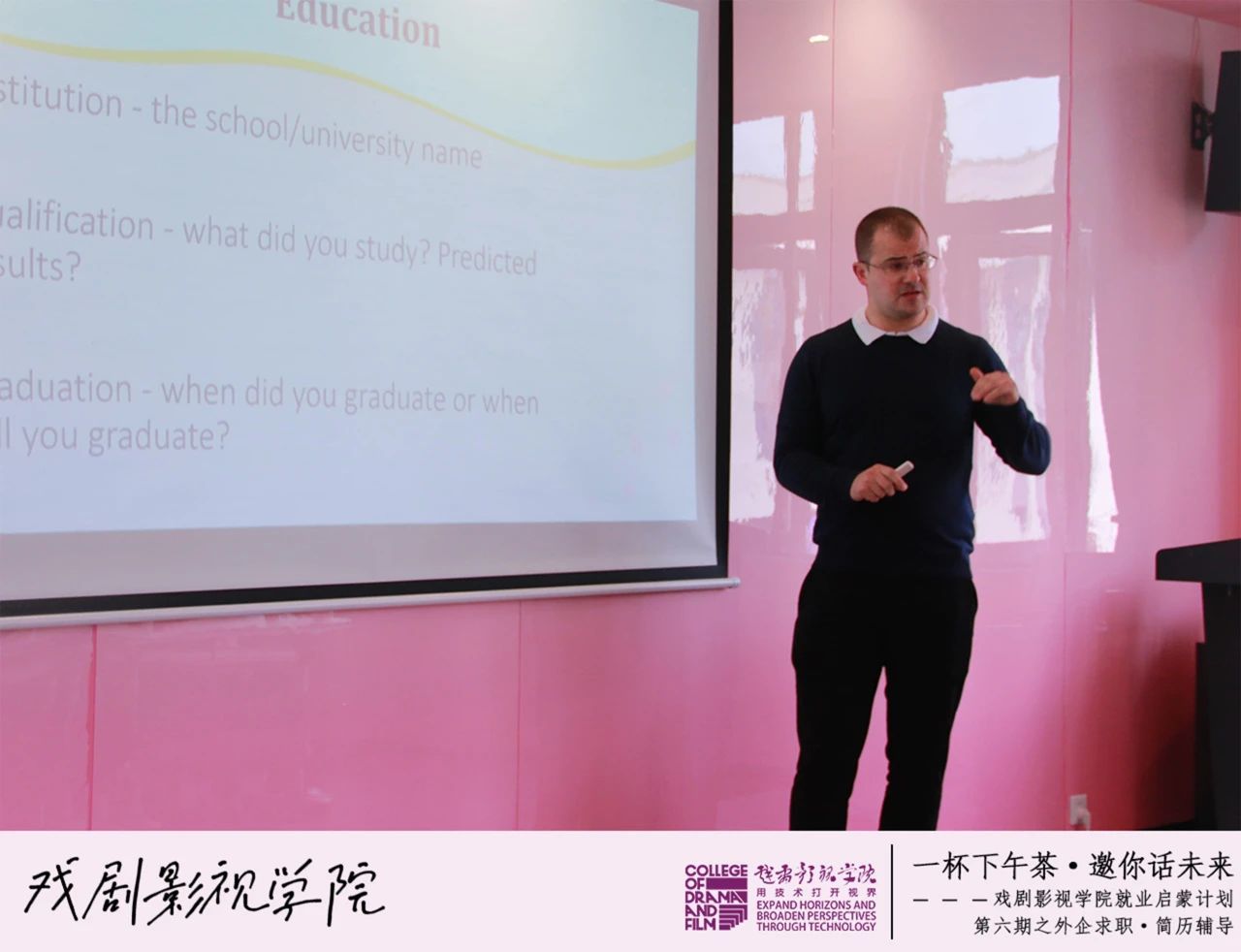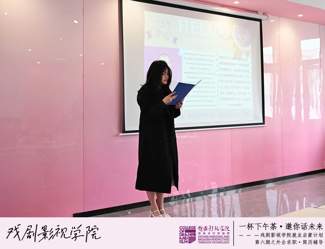 毕业季临近,面对考研、留学与外企求职的多重选择,许多学生陷入迷茫。为帮助同学们理清方向、规避风险,戏剧影视学院就创助理团于4月2日下午在丁山书院白羊座演讲培训室举办“‘一杯下午茶·邀你话未来’第六期之外企求职·简历辅导”活动。活动特别邀请到重庆移通学院外籍教师弗兰克・杰恩(Frank Jayne)老师、国际教育学院规划导师李老师与戏剧影视学院廖炳屹老师,为专升本及大三学生提供就业指导。