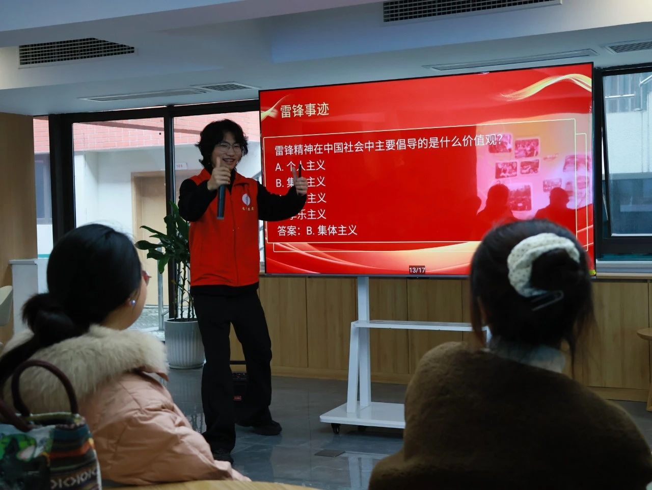 活动开始,主持人分享了雷锋的经典事迹——“雷锋冒雨护送老人”。在他的讲述中,雷锋的形象生动地展现在听众眼前,仿佛他真的就在那里,站在雨中,用他的行动温暖着老人的心。那一刻,听众们仿佛被带回到了那个年代,亲眼目睹了雷锋如何在那场雨中,用他的善良和勇气,书写了一段令人感动的故事。