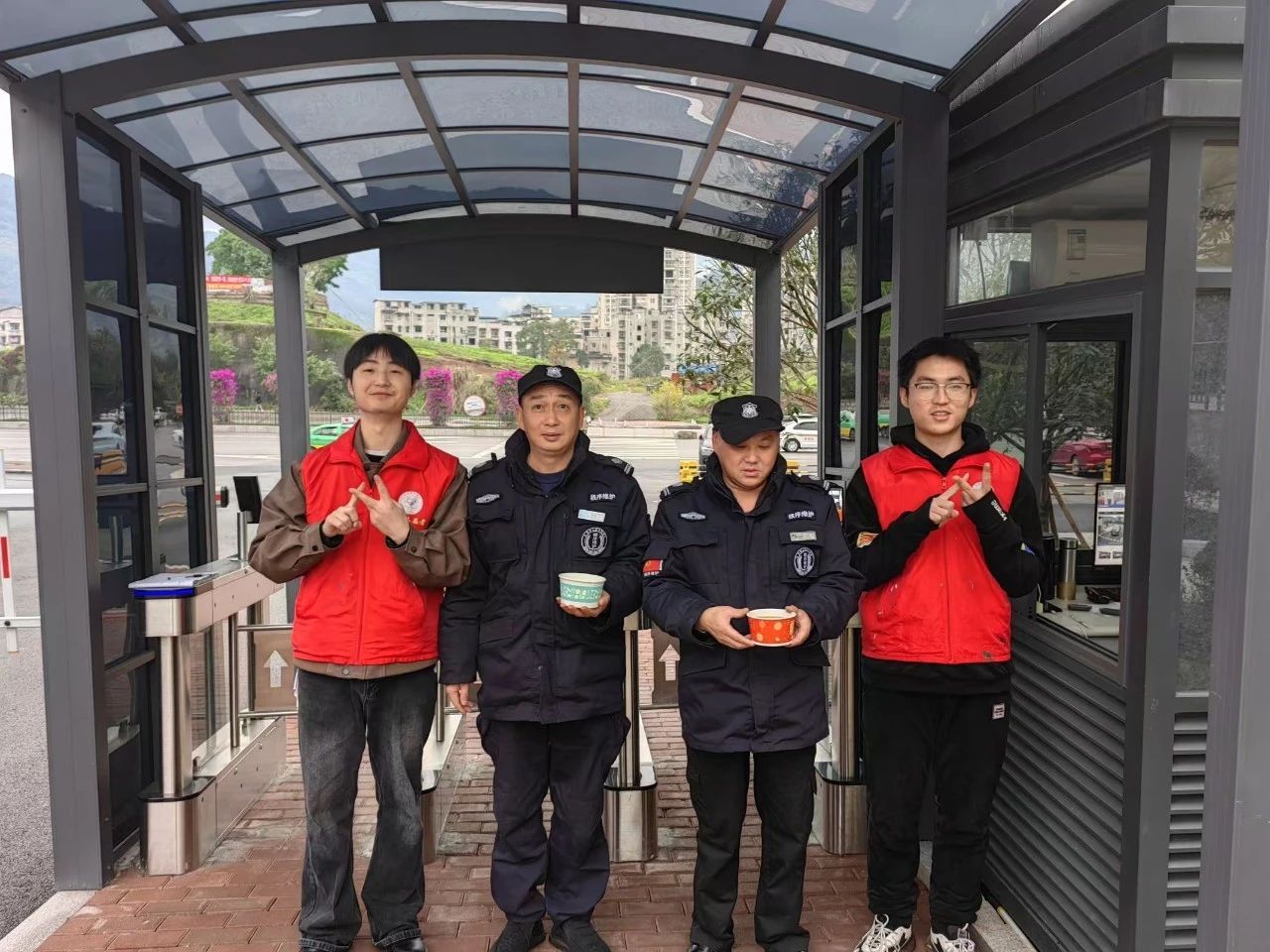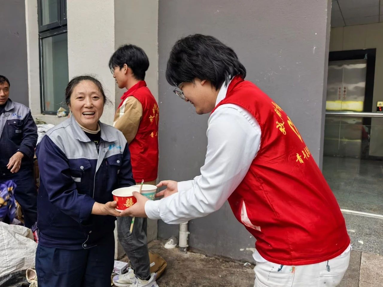 在完超活动筹备期间,辅导员邓艳老师强调,“在追求学习卓越的同时,也要重视活动中的全面发展和社会实践能力以及社会责任心的培养”。特此支部将完超团日活动与志愿服务相结合,开展“完超携手志愿行,青春力量暖人心”活动。班级成员分成小组,分别前往校园保安亭、书院值班处等地进行志愿服务,为他们送去热粥、热汤,传递冬日温暖与关爱。这一举措不仅体现了支部成员的社会责任感,也弘扬了志愿服务精神,激发了更多同学参与公益活动的热情。