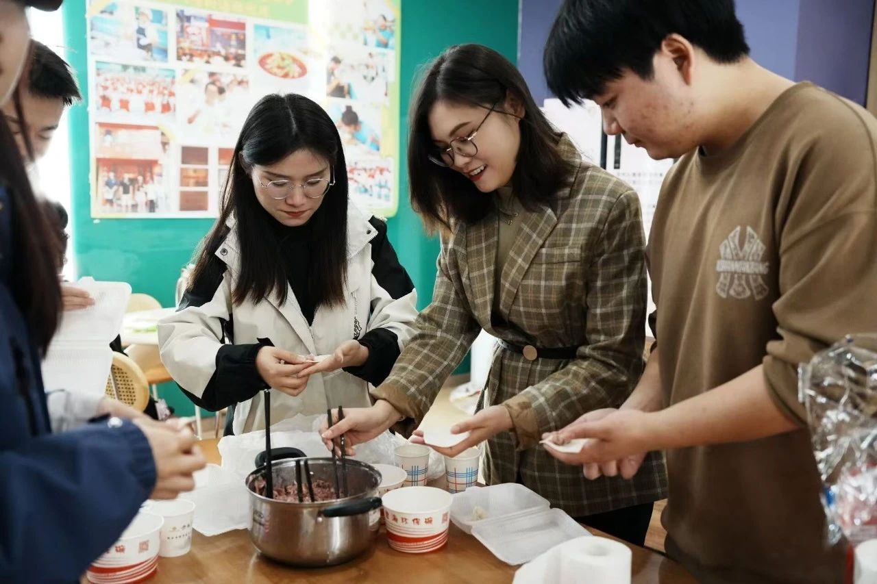 在精心烹制美食的同时,学院学工办主任曾玉娇老师与团总支书记邓艳老师正率领同学们,热火朝天地投入到抄手的制作过程中。师生们共同参与,体验动手制作的乐趣,促进了师生间的互动,传承了地方文脉的精髓。在共同制作的过程中,大家相互帮助、相互支持,形成了良好的氛围,增强了班级的凝聚力和向心力。