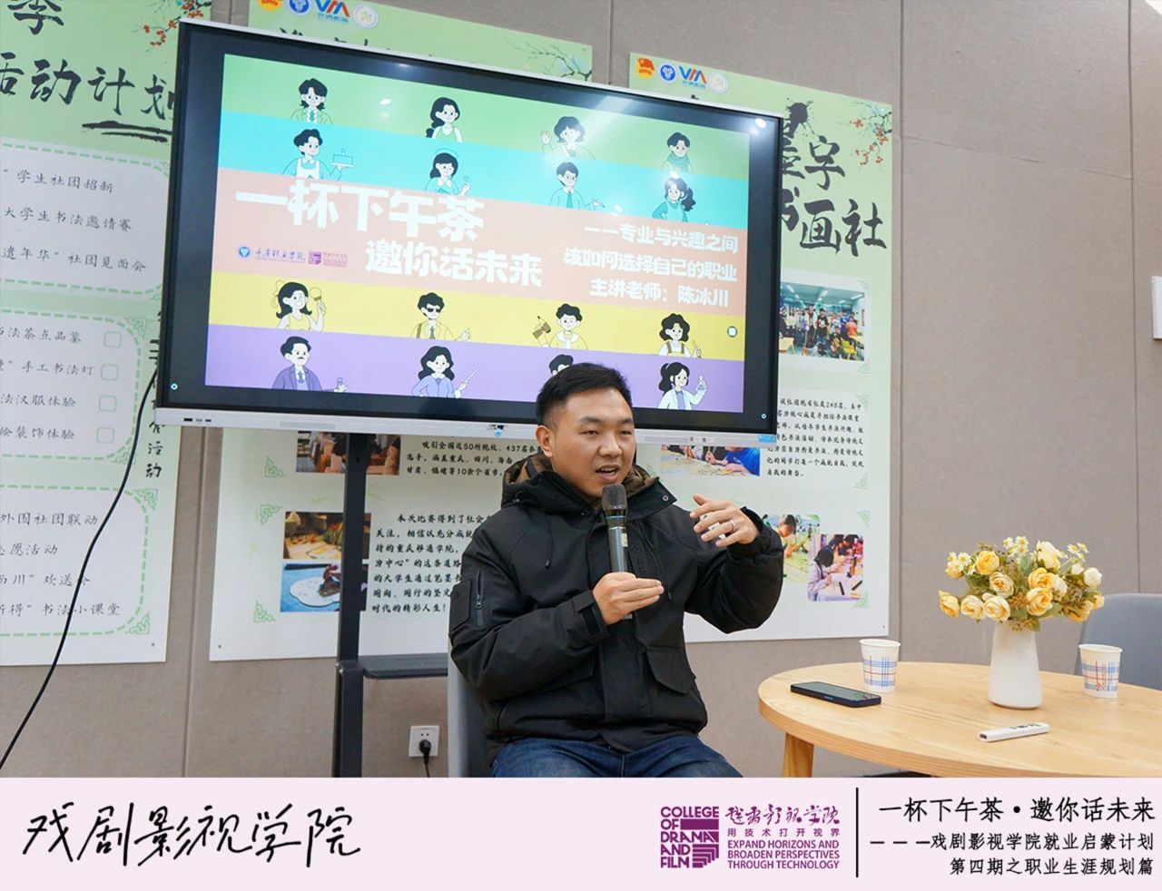 在就业环境复杂多变的背景下,为了解答同学们在专业与兴趣之间如何选择自己的职业方向的疑惑,帮助同学们理清职业选择与专业和兴趣之间的关系,扩大未来职业选择范围,明确就业方向,2024年12月13日,戏剧影视学院“一杯下午茶·邀你话未来”就业沙龙第89期暨戏剧影视学院就业启蒙计划第四期之职业选择篇在瀛溪书院很正式研讨室里开展,本次活动荣幸邀请到了重庆理工大学硕士、中级会计师、著名企业优秀员工、优秀指导老师陈冰川老师,到场老师还有戏剧影视学院林西康老师、李梦雪老师和廖炳屹老师,由他们为戏娃们解惑答疑。