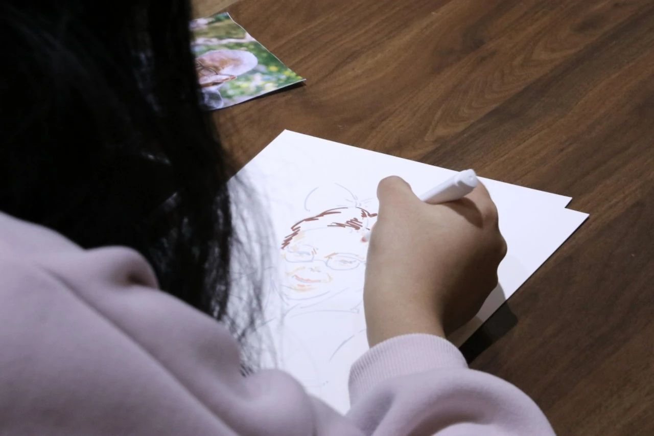 活动伊始,“小精灵”们汇聚一堂,他们手持充满魔力的画笔,以老人的岁月痕迹为鉴在时光画布上施展创意魔法。有的为老人画上了俏皮的粉红脸蛋;有的则用鲜艳的色彩描绘出老人和蔼的笑容。他们在画纸上勾勒、涂抹,色彩在他们的巧妙调配下欢快地跳跃、融合。渐渐地,一个个充满奇幻色彩和童真童趣的卡通头像诞生了!