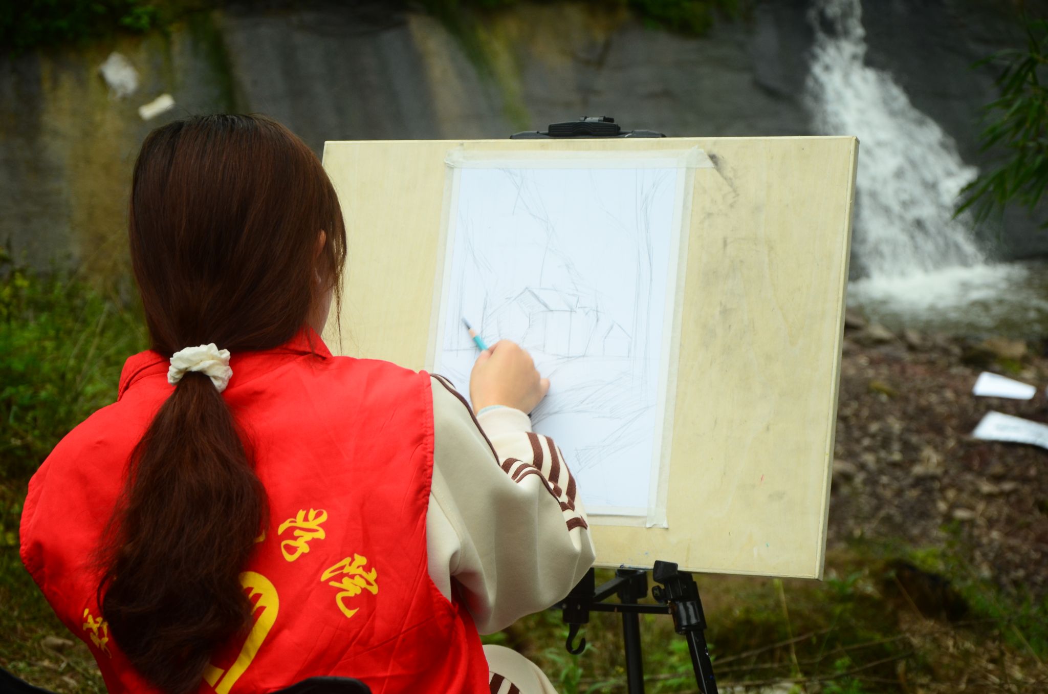 清理结束,同学们有条不紊的分散寻找各自心仪的景色完成自己的写生作品,有的独自作画,有的协作共创,各种绘画工具在同学们的手中翩翩起舞,笔尖灵动地一笔一划勾勒出了登瀛的自然风貌,为日后的专业学习巩固基础,提高了美化环境意识。