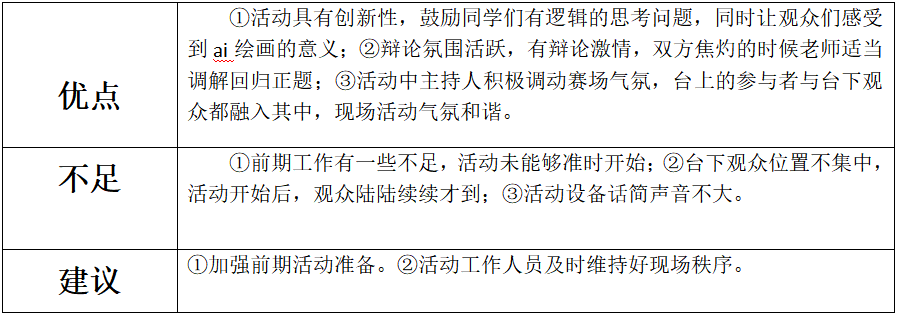 活动于10月16日下午16:30在綦河书院二号楼智慧教室开展,活动围绕“AI绘画是否推动艺术发展”这一辩题展开激烈交锋。比赛现场氛围紧张而热烈。“一人之辩重于九鼎之宝,三寸之舌强于百万之师”,思维在辩论中得到提升,智慧在辩论中得以彰显。同学们在比赛中不仅锻炼了语言表达能力和思辨能力,还提升了团队合作能力。相信此次活动定将在同学们心中埋下一颗敢于辩论,善于辩论的种子,助力他们在未来的人生道路上一展自己的风采。