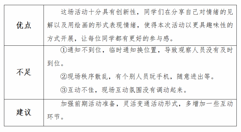 此次活动主要是同学们互相分享自己的绘画作品,台上同学在分享自己的作品时,还会插入一些相关的感受,我觉得这非常的有趣,同时这也让我对自己的情绪多了一些了解。