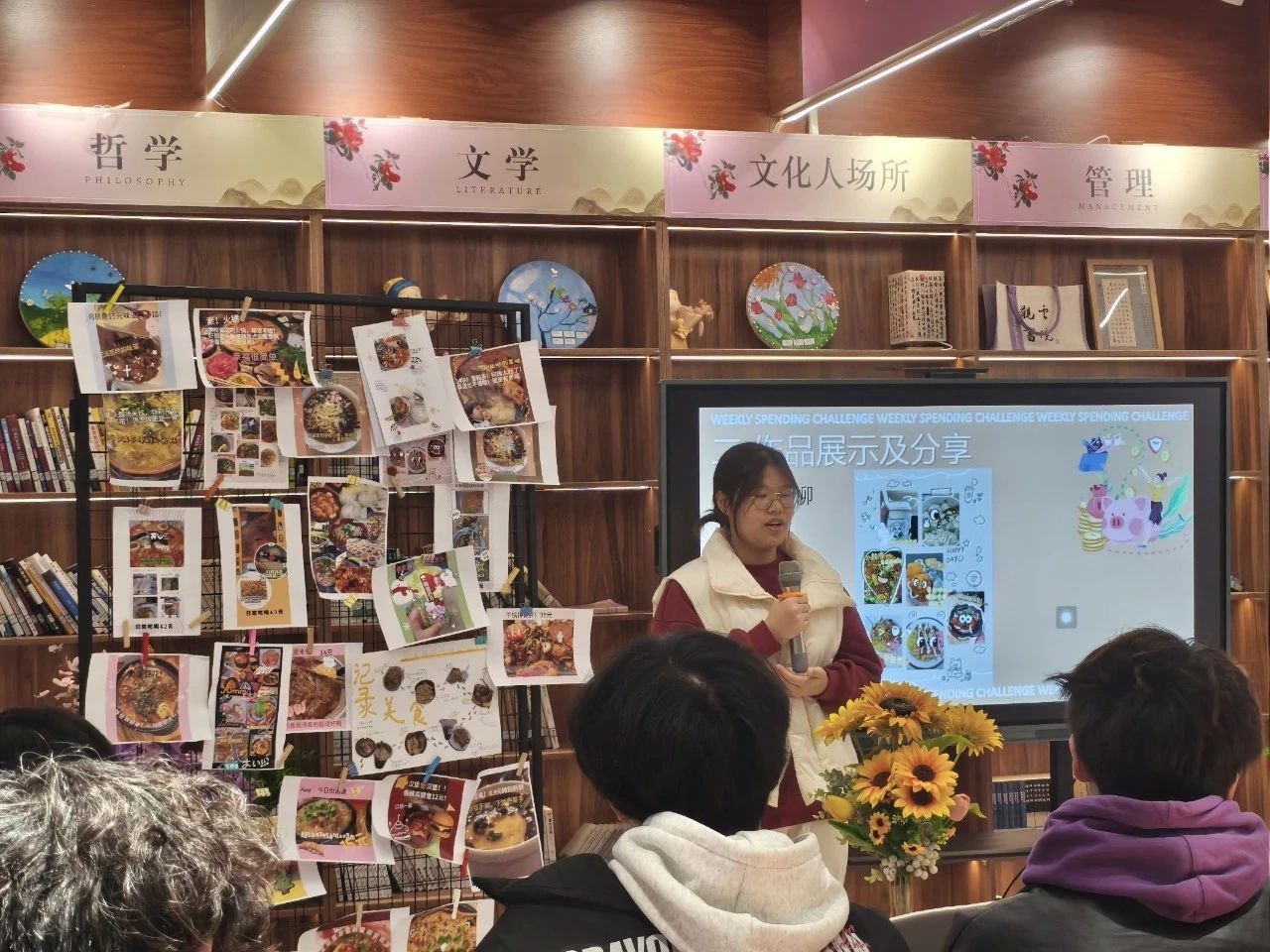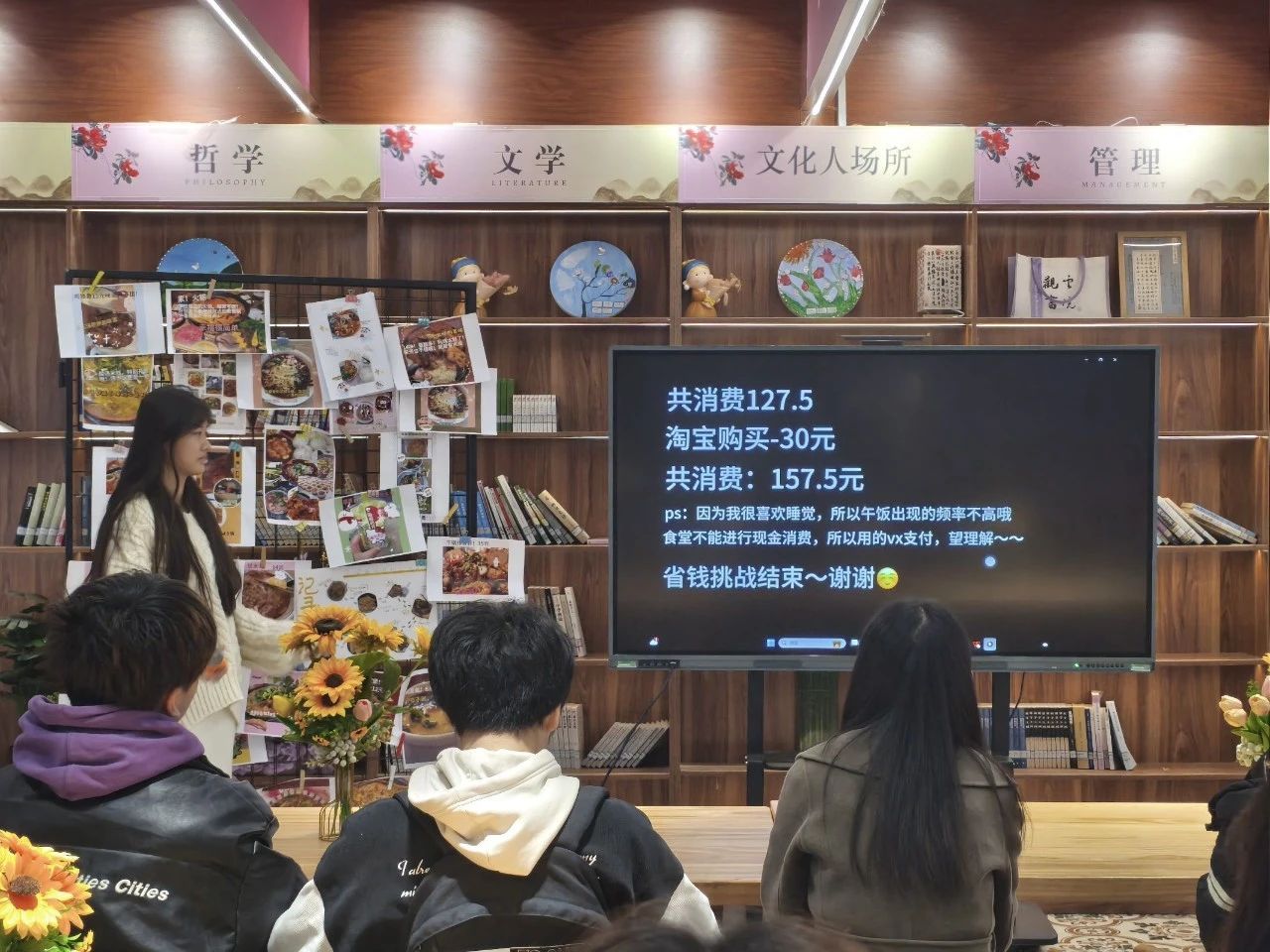 本次活动通过线上自主报名,线下实践的方式参与挑战,参与者需在 11 月 24 日至12 月 1 日这一周内仅用现金支付,减少电子支付以控制消费。最后以plog或vlog的形式展示,记录并分享在为期一周的挑战内用200元现金消费的全过程。分享会现场,主持人介绍了活动内容,随后逐一展示了挑战成功的参与者们精心制作的plog作品,这些作品色彩丰富,都有精心装饰过的痕迹,图片上的美食让人看了垂涎欲滴。还有用心制作的手工小海报,每一幅作品都充满了生活的气息与幸福感。
