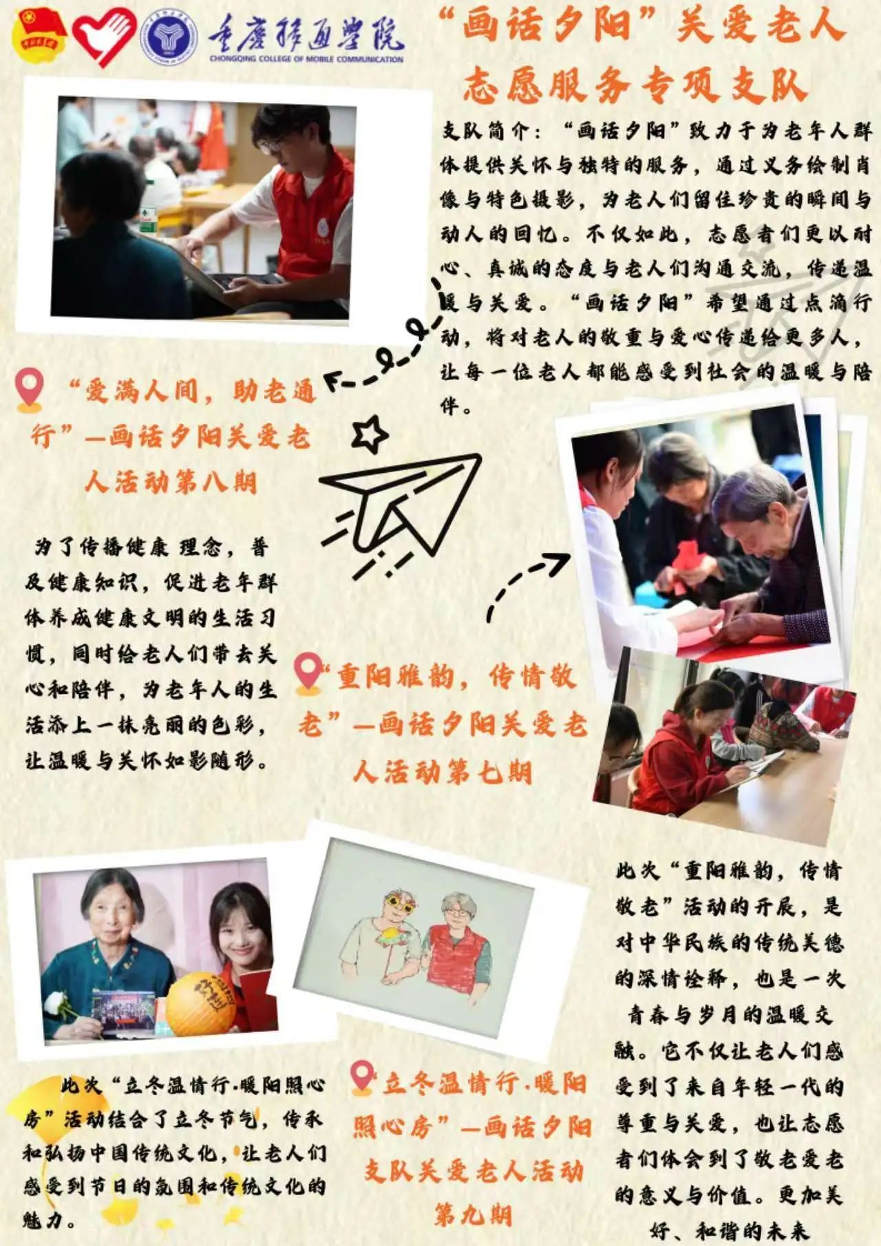 “画话夕阳”关爱老人志愿服务专项支队,是一支充满温暖与艺术情怀的团队,致力于为老年人群体提供关怀与独特服务。支队秉承“用画笔记录故事,用镜头定格美好”的理念,通过义务画像、义务话事与特色摄影,为老人们留住珍贵的瞬间与动人的回忆。支队积极走进社区与养老机构,组织各种主题活动,为老年人打造一个充满艺术与欢乐的精神家园,让每一位老人都能感受到社会的温暖与陪伴。