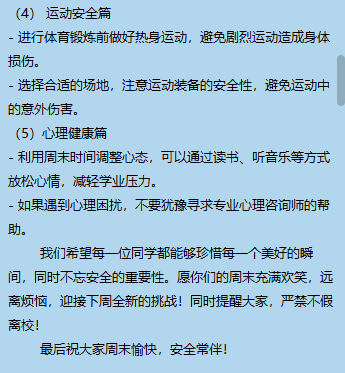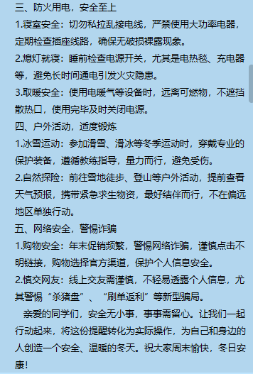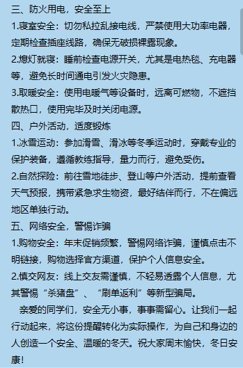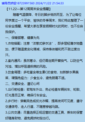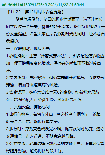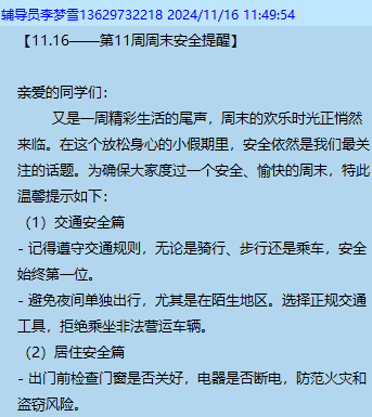 为进一步筑牢校园安全防线,确保师生度过一个安心宁静的假期时光。戏剧影视学院每周五会向全院师生发送“周末消防安全提醒”提示信息,这项常态化的提醒机制,已成为学院安全文化建设的一项特色亮点。