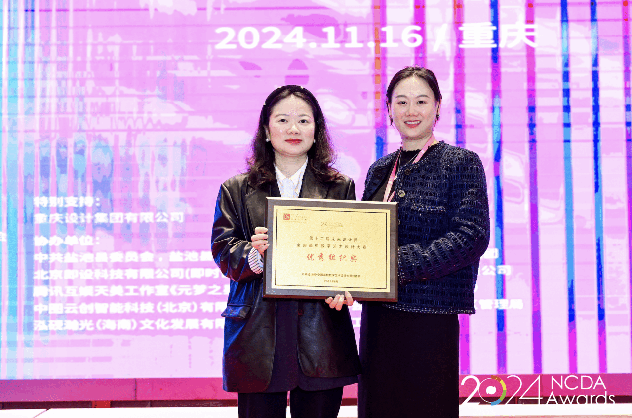 此外,在全国高校数字艺术设计大赛(NCDA)赛道中,戏剧影视学院因其出色的组织能力和学生的优异表现获得2024第12届未来设计师·全国总决赛优秀组织单位奖,李如冰副教授获优秀组织教师奖;熊琳老师凭借其丰富的教学经验和专业的指导能力指导作品获评优秀指导教师代表;学生夏荷林获国家级三等奖,王琳、莫中雪、舒晶琴、胥小蕊分获省部级二等奖及省部级三等奖。戏剧影视学院王芳副院长作为颁奖嘉宾,为优秀指导教师颁发了荣誉奖项。