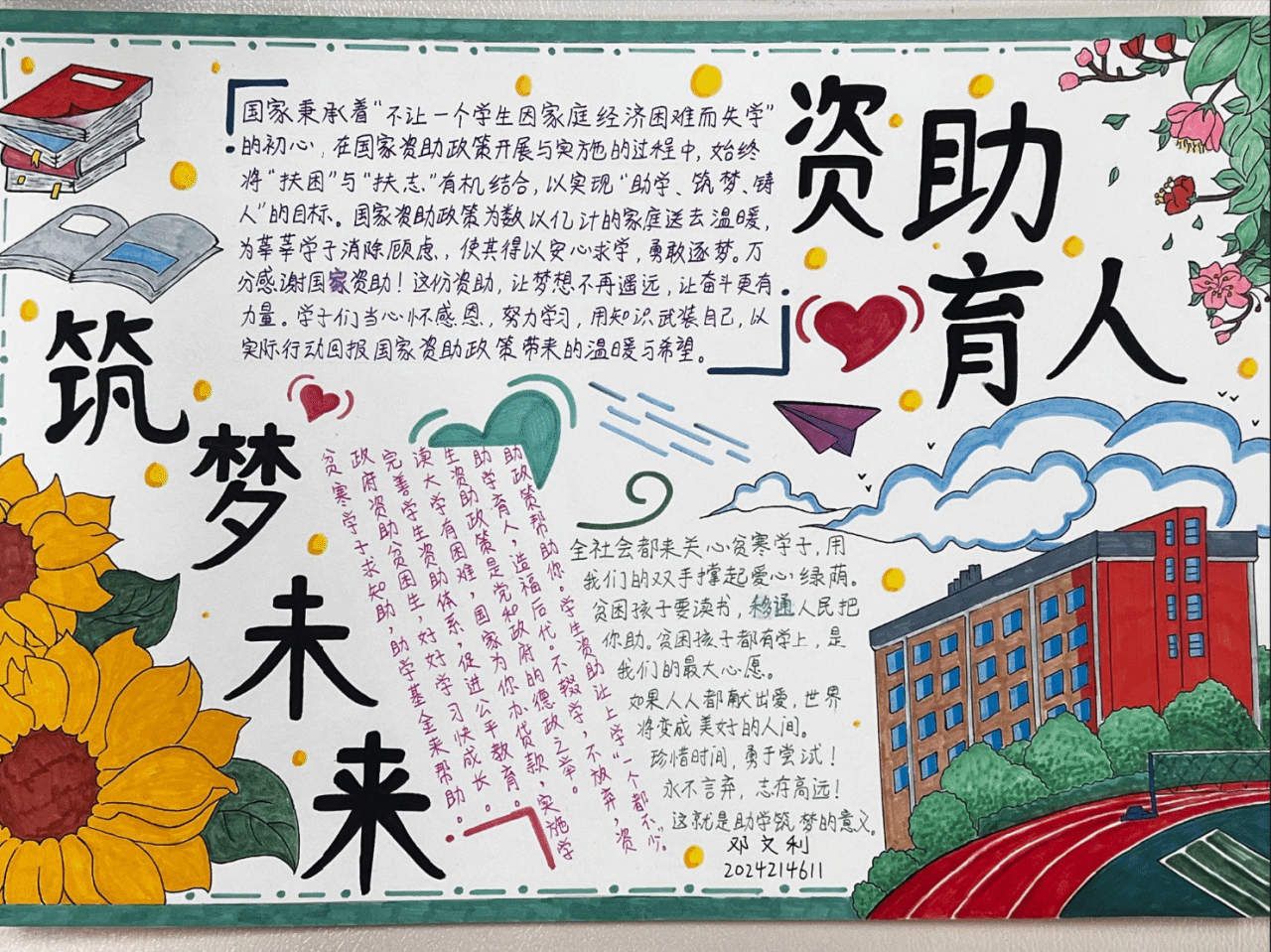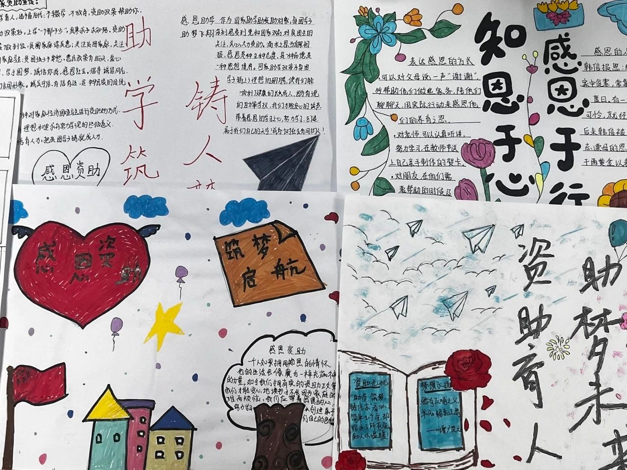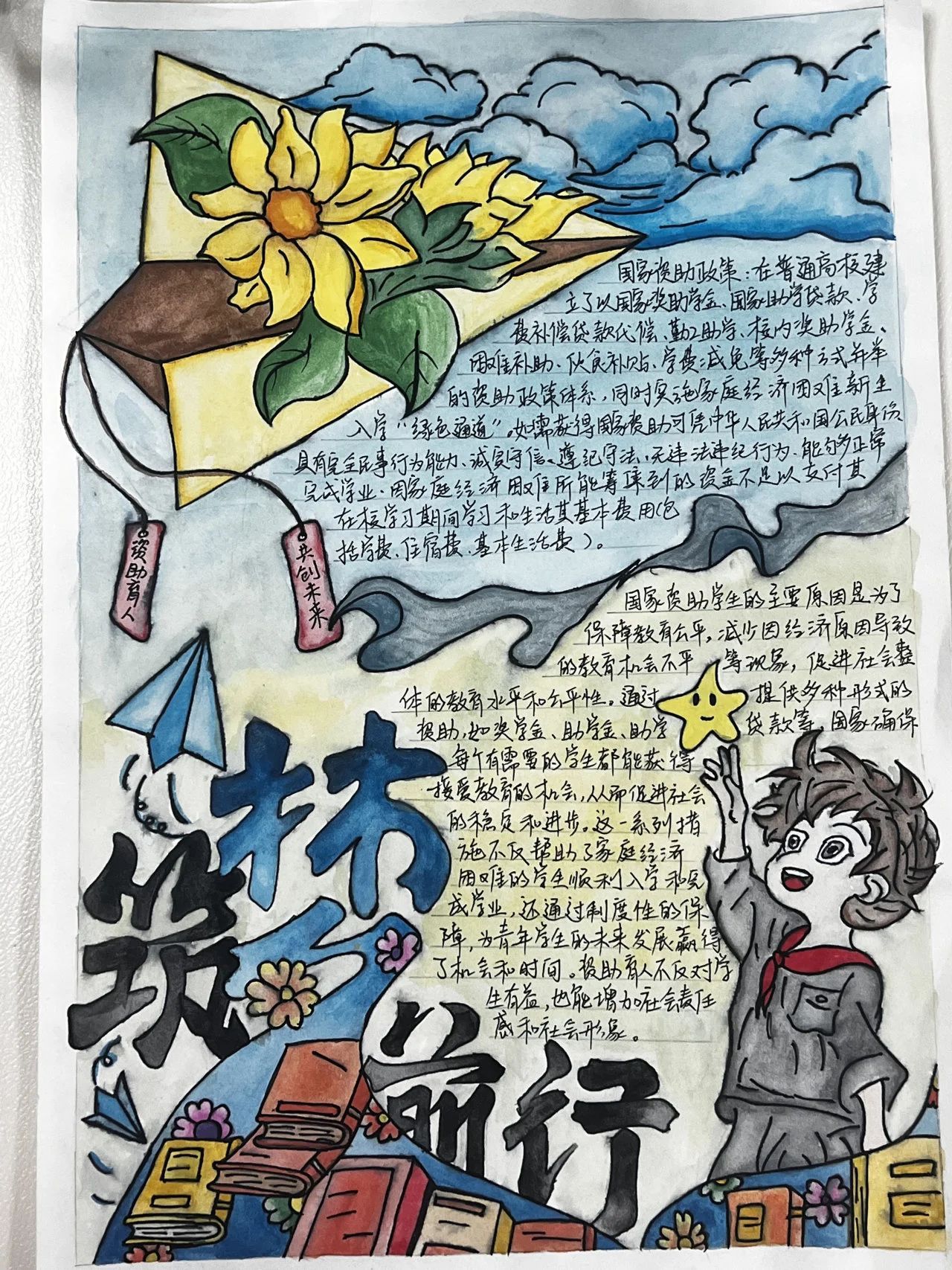 在活动期间,同学们参与热情高涨,踊跃投稿,共收集到各类作品达 160 余件。每一件作品都凝聚着同学们的心血,也承载着他们对于资助育人这一主题独特的理解与感悟。手抄报作品共计37件,它们宛如一幅幅匠心独运的绚丽画卷,满载着深厚而真挚的情感与信息。这些作品以工整隽秀的文字、精致细腻的插画,或深刻解读国家资助政策的内涵,或生动展现资助所带来的巨大影响,或深情抒发受助者的感恩之心。无论是画面布局还是文字表述,都深切地流露出参与者对资助的珍视与感激之情,以及资助在他们成长历程中所镌刻下的不可磨灭的印记。