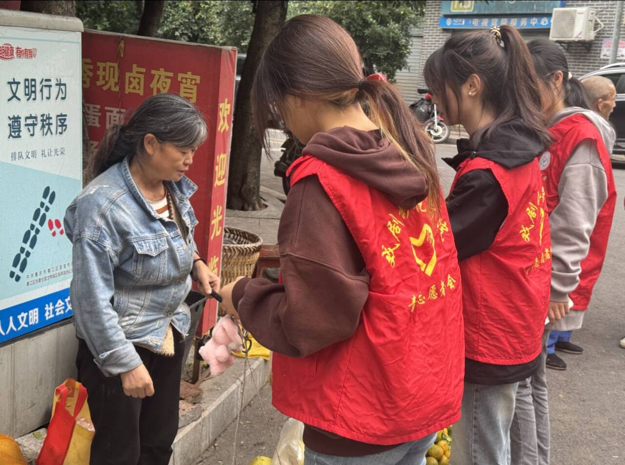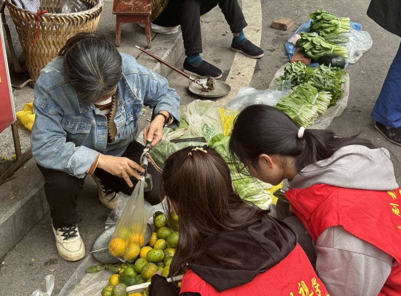 在时光的角落里,有一群老人守着小小的摊位,他们的身影如同岁月的守望者。我们来到老人们摆满了水果蔬菜的摊位上。老人们用心的给我们介绍他们自己种植的蔬菜水果,我们在购买水果的同时也帮助老人们吆喝着卖蔬菜,在与老人的交流中,我们看到了他们眼中的喜悦和感动。那一抹笑容,如同冬日的暖阳,照亮了我们的心灵。志愿的力量或许微小,但却能汇聚成爱的海洋,让老人们感受到社会的温暖与关怀。