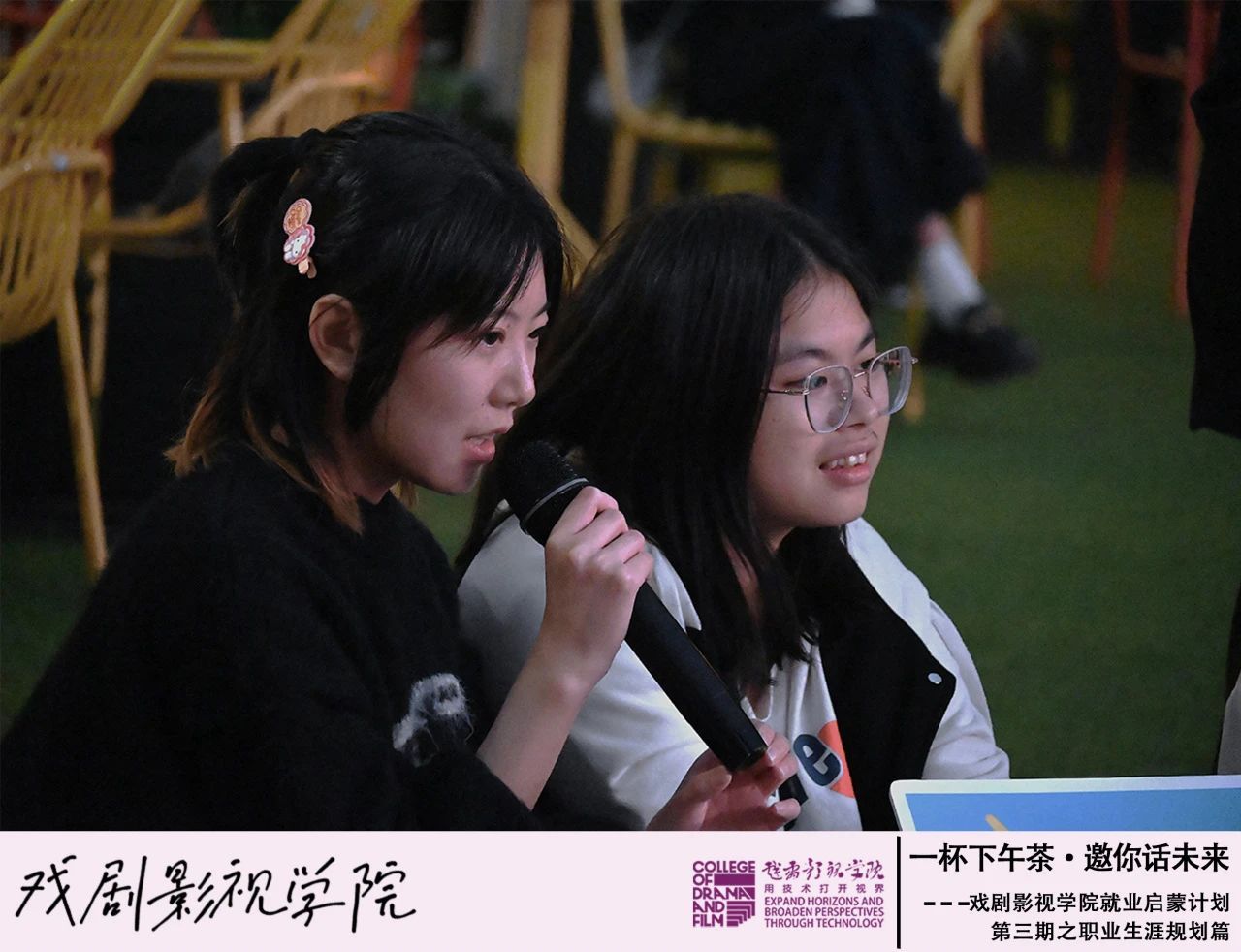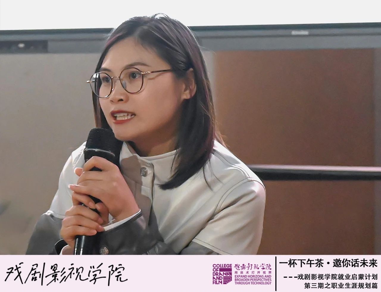 罗老师分享结束后,戏剧影视学院学工办主任曾玉娇老师介绍了“一杯下午茶·邀你话未来”就业启蒙计划的举办初衷,并引导在座同学们主动交流,勇敢表达,同学们纷纷举手提问,向老师们请教自己迫切关心的职业规划和个人成长与选择的问题。针对2024级动画6班刘定南同学提到的创业过程中应更加重视能力的培养还是积累人脉的问题,罗老师提出两者都很重要,廖老师提到“打铁还需自身硬”,曾老师从专业学习、就创赛事、完满教育等维度为同学们分析专业技术能力提升和人脉资源积累的技巧和方法,鼓励同学们在学习、实践中,主动与学院老师建立联系,打造创业项目,寻求更多更大的帮助和支持。