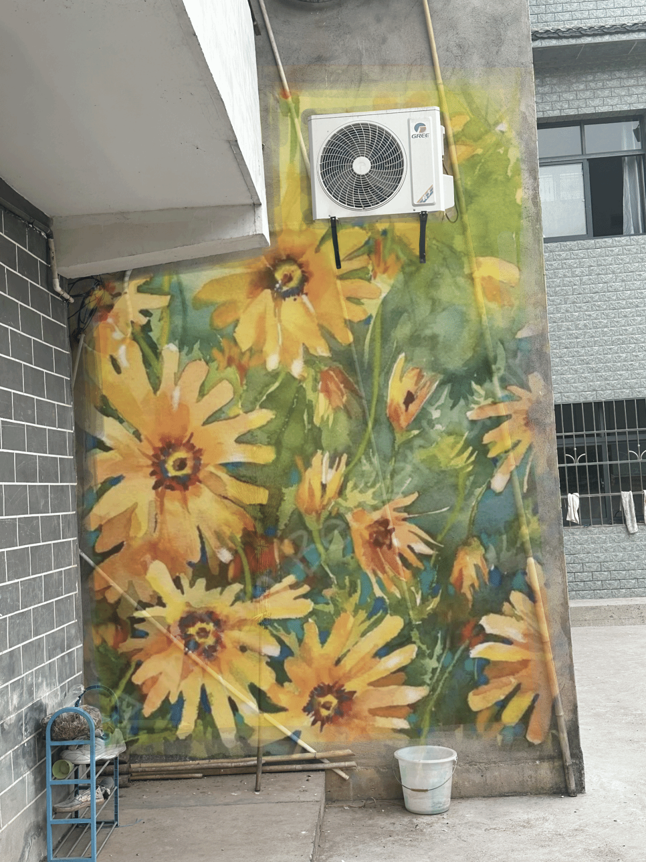 调研结束后,志愿者们返回学校,投入到了一场为期14天的墙绘设计稿创作中。他们以东溪镇深厚的历史底蕴为灵感源泉,巧妙融合当地特色,如非遗板绘元素和古韵村落的独特建筑风格,精心设计出他们心中关于和美乡村的墙绘蓝图。这些作品不仅生动展现了古镇的建筑风貌和文化遗产,还巧妙融入了壮丽的自然风光,将东溪镇的乡村景观及文化底蕴全面呈现。