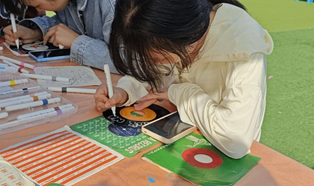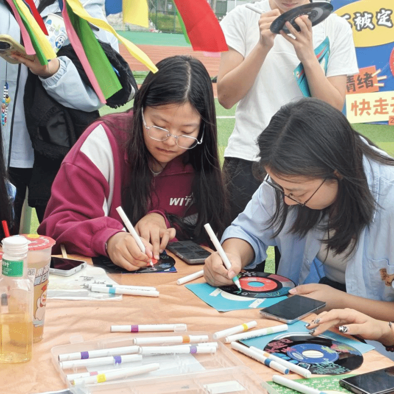2024年“大学城·古剑山音乐节”于10月19日至23日盛大启幕!戏剧影视学院社团实践部在这“綦綦怪怪”聚集地开展“消除偏见,涂个好心情——Don't Emo情绪大作战”活动。参与者们通过拿起情绪调查表,审视内心深处最隐秘的角落,对自身情绪精准捕捉,深入剖析自我情绪。随后黑胶碟成为了他们情感释放的广阔舞台。拿起彩笔的瞬间,仿佛打开了情绪的阀门。他们将内心的情绪毫无保留地倾注于笔尖,化作多彩笔触。有的笔触轻快活泼,那是喜悦在跳跃;有的笔触深沉凝重,承载着悲伤的重量。每一笔都像是在诉说着一个故事,或是生活中的小确幸,或是成长路上的挫折与难过。随着最后一笔落下,乐音的止息,这场艺术疗愈之行圆满落幕。此次活动借绘画与音乐的融合于这奇妙的“綦綦怪怪”聚集地,偏见消弭,好心情满溢。