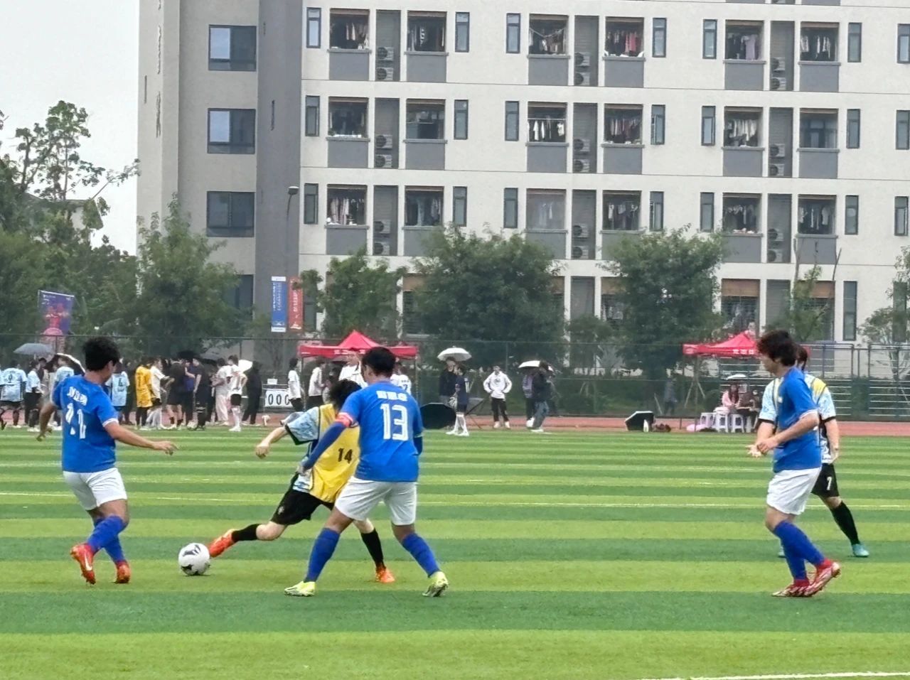 2024年10月28日中午,戏剧影视学院足球队与大数据学院足球队在足球场 展开了一场激烈的角逐。裁判一声哨响,队员们迅速进入状态,传球、过人、射门,每一个动作都如行云流水般流畅。他们在绿茵场上奔跑着,那是青春与拼搏。戏剧影视学院的队员们展现出强烈的进攻欲望,双方队员互不相让,战况焦灼,最终上半场以2-1的优势结束。下半场比赛进入白热化阶段,戏剧影视学院的队员们凭借着精湛的技术与默契的配合,将比分拉开差距。但大数据学院的队员们也不甘示弱,凭借优秀的体能与防守紧咬比分,抓住每一个机会。比分锁定在4-4,一脚突如其来的射门结束了比赛,戏影男足最终以一分之差4-5遗憾告别决赛舞台。