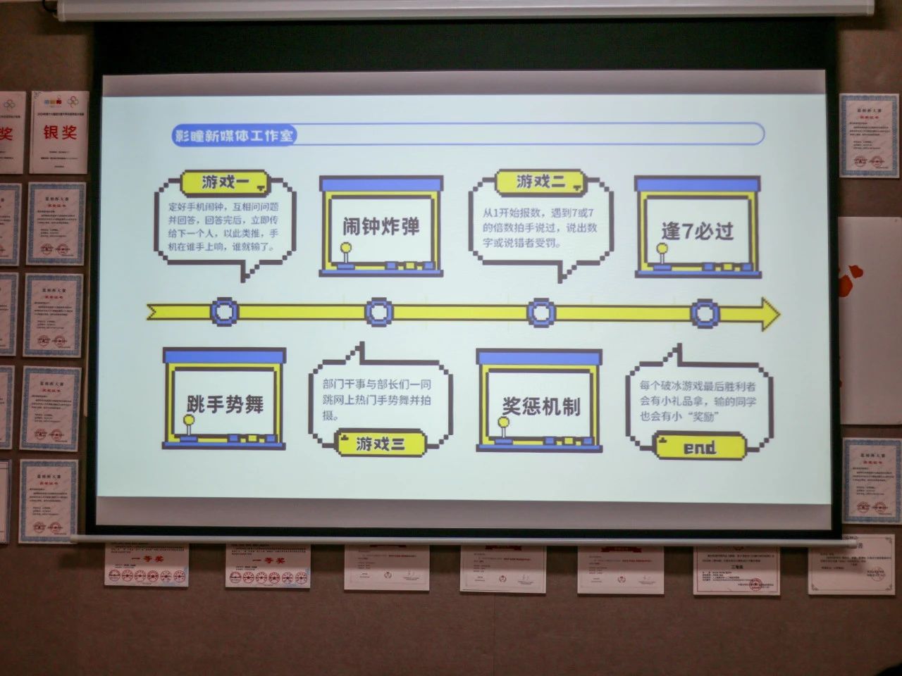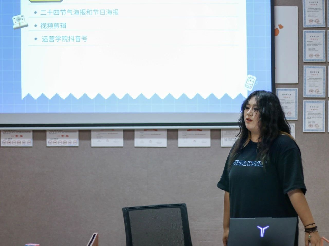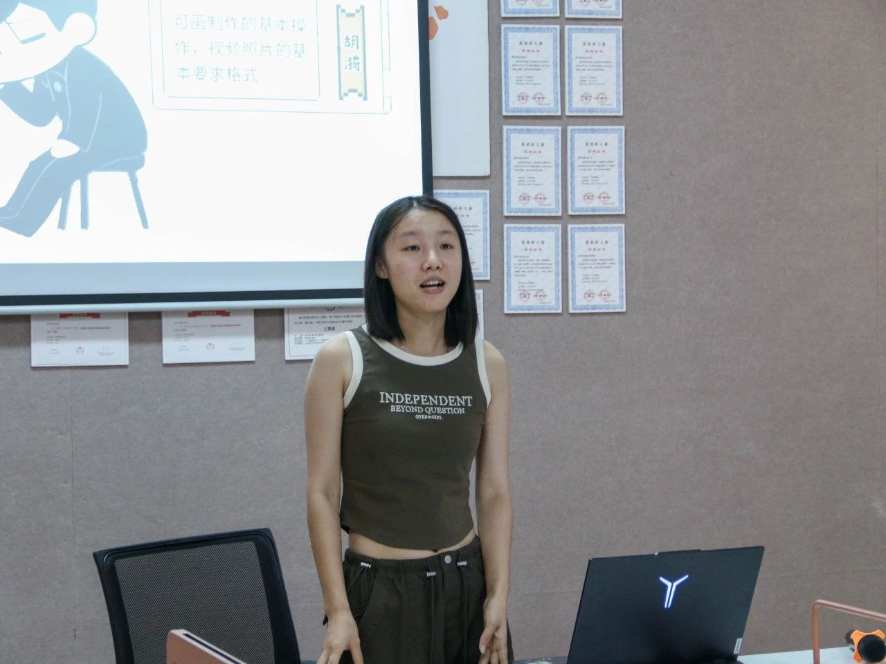 活动开始,张向琴学姐以及三位干部带领新进干事们依次介绍了自己的兴趣爱好,让大家熟络了起来。随即三位部长分别向新成员们详细的讲解了影瞳的组织架构和工作内容,主要分为文案组、设计组和技术组。文案组主要负责小戏官Q的运营、月度专栏的文案整理、完满网以及外媒的投递,设计组主要负责官方抖音的运营、设计海报和视频剪辑,技术组主要负责戏剧影视学院官方公众号的稿件审核及排版。部长们的介绍让新成员们对自己即将参与的工作有了初步的了解,也对部门的重要性和未来发展方向有了更清晰的认识。