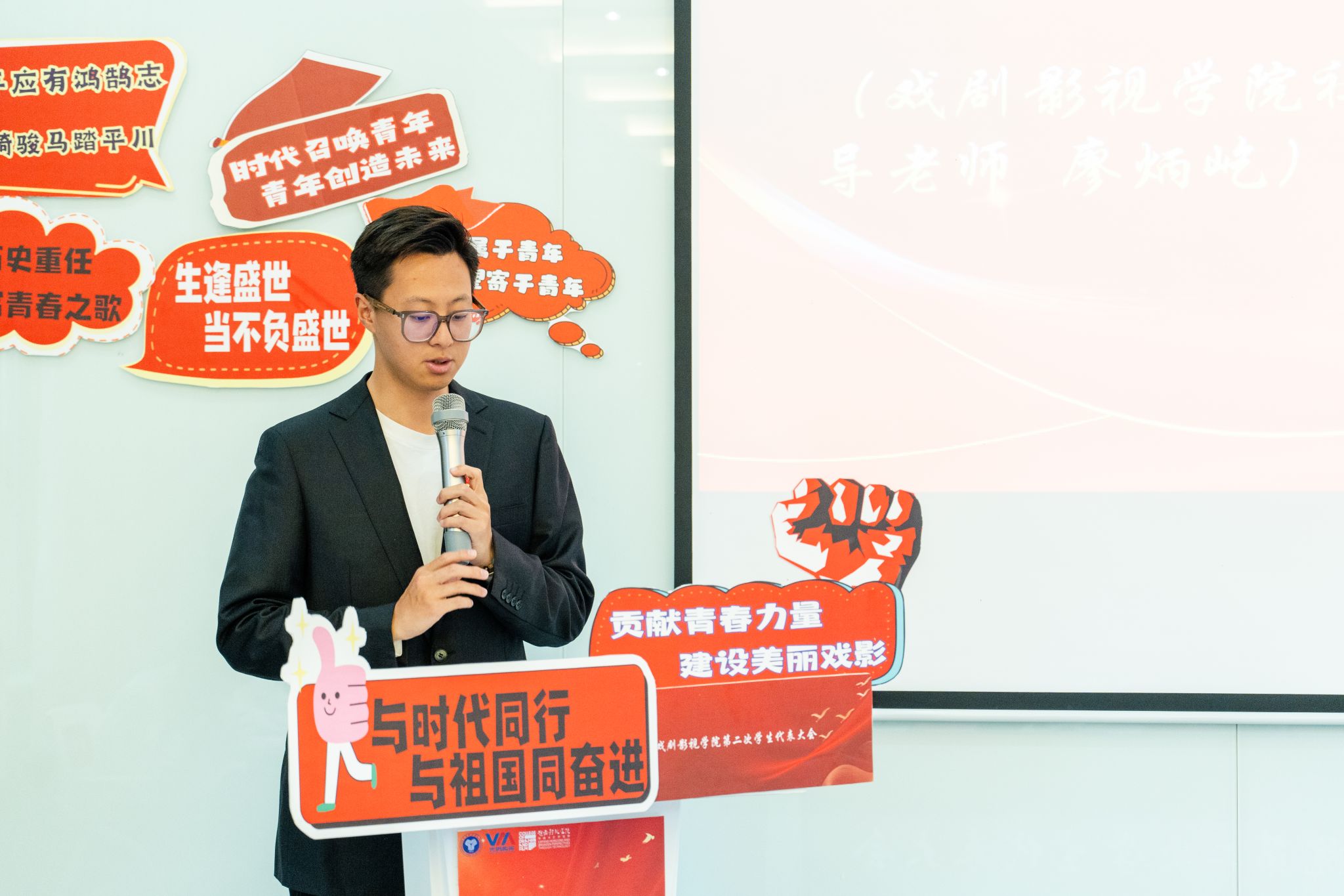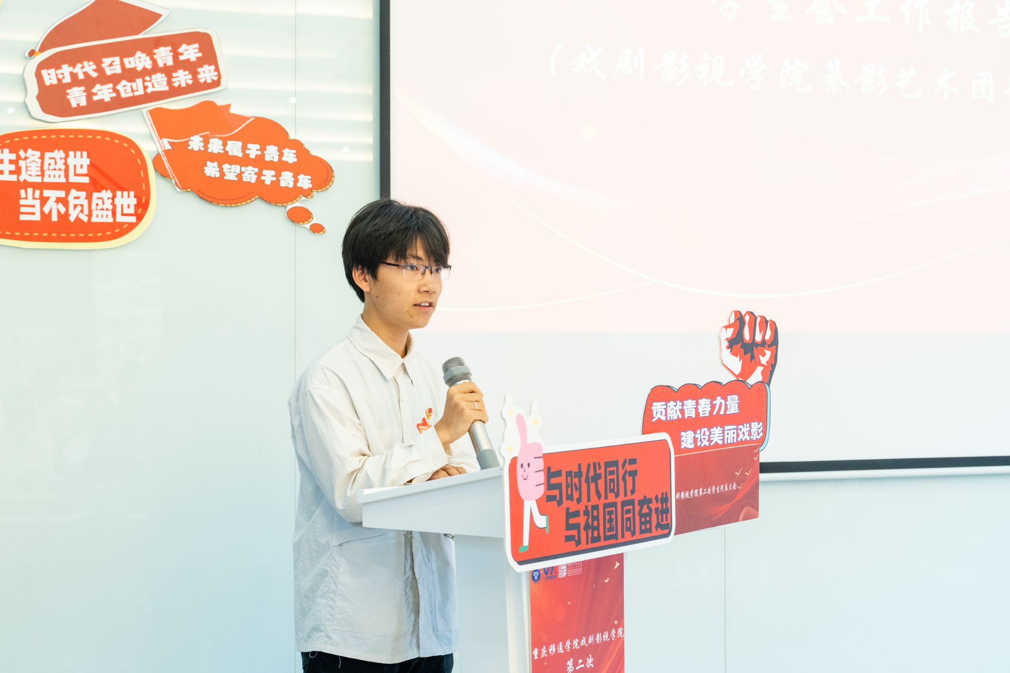 戏剧影视学院綦影艺术团团长梁高智同学代表第一届学生会作工作报告,报告全面、客观回顾总结了过去一年我院学生会的工作和经验,明确了当代青年学生的历史使命和学生会的工作任务,为下一届学生会工作提供了指导和方向。